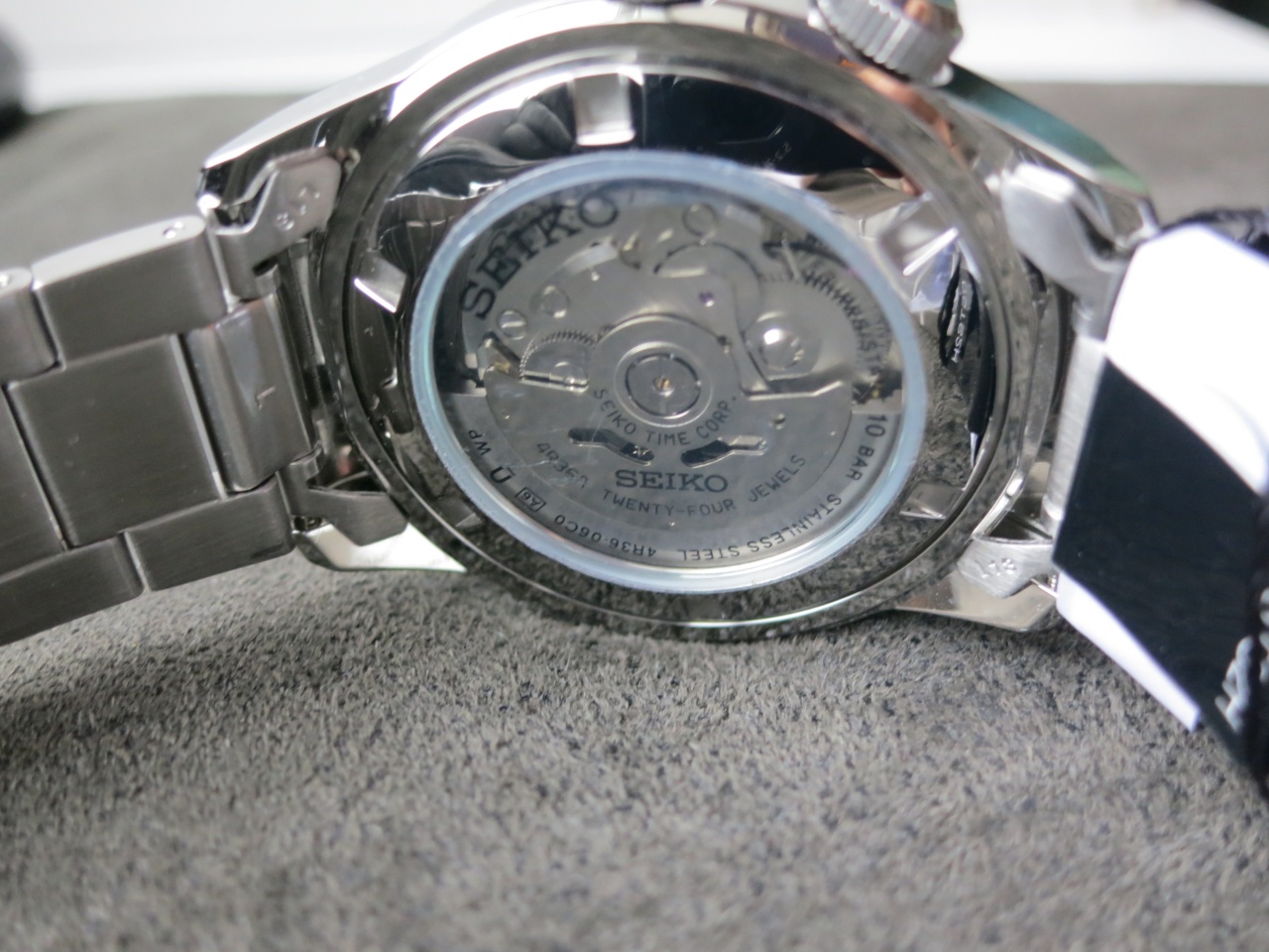 Трехстрелочный механизм 4R36A с автоматическим подзаводом, ручным заводом и стоп-секундой. Запас хода – 40 часов. 24 камня. Отображение дня недели и даты в положении «3 часа». Синий циферблат. Минутные маркеры вокруг внешнего обода с возможностью вращения в двух направлениях головкой в положении «2 часа» . Люминесцентные стрелки и метки. Стекло Hardlex - специальное устойчивое минеральное стекло запатентованное Seiko. Прозрачная задняя крышка. Материал корпуса и браслета выполнен из нержавеющей стали. Диаметр 42 мм. Толщина 11 мм. Расстояние между ушками 22 мм. Водонепроницаемость 10 Bar (100 M) / 330 Ft. Производство: Япония.