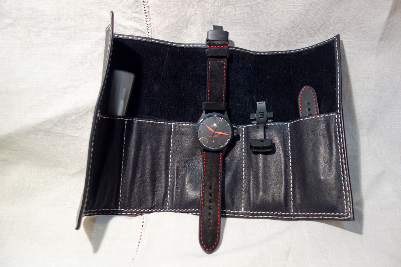 Ремешок: 22х22, чёрный замшевый (с красной подкладкой), дополнительный чёрный кожаный (с красной подкладкой).