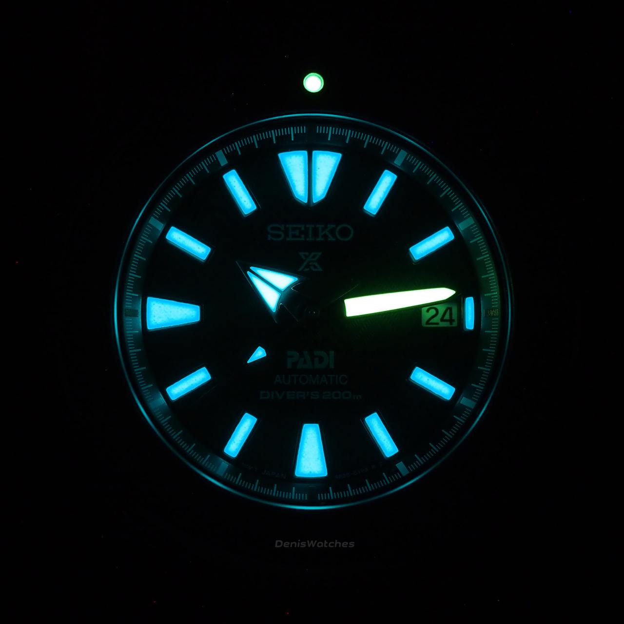 Люминесцентные стрелки и метки, минутная стрелка и точка на безеле зеленые, остальные элементы голубые, фирменный очень яркий люм - LumiBrite