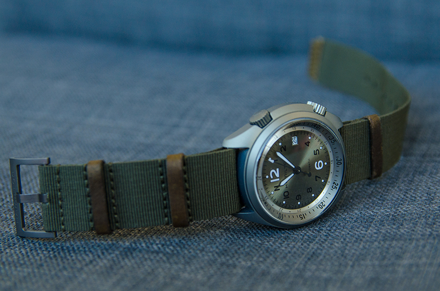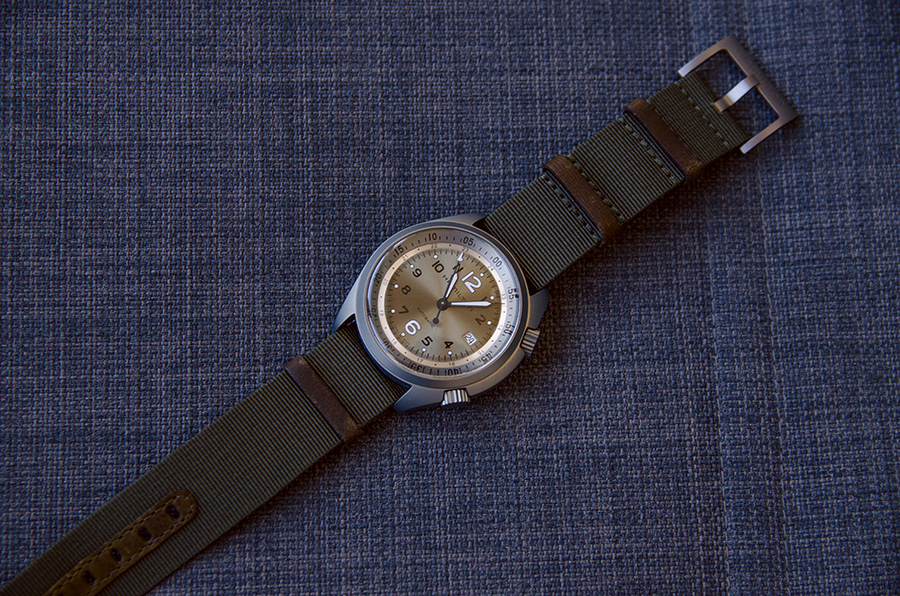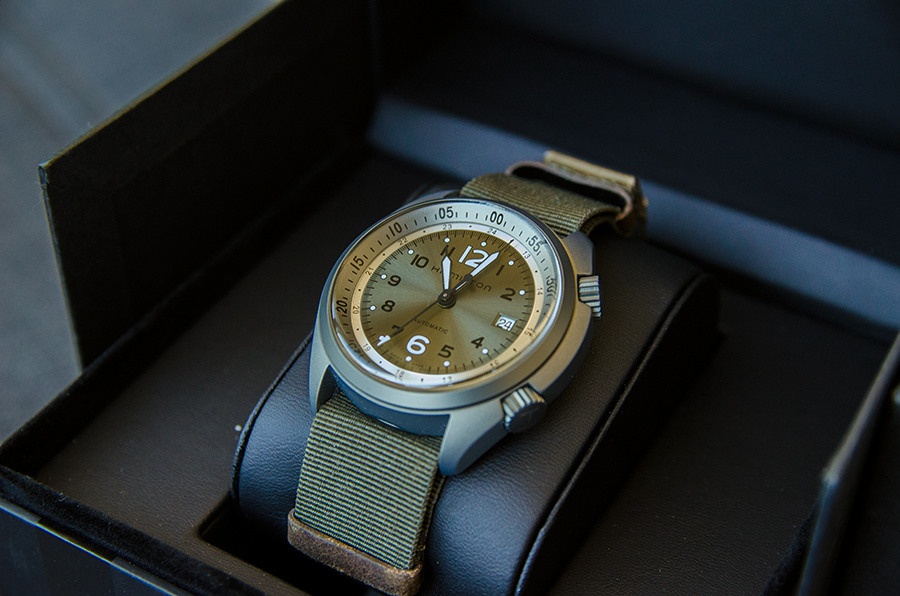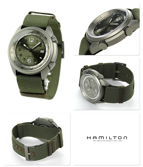 Созданные из материала, часто используемого в авиации -"крылатого металла" Алюминия, модель Khaki Pilot Pioneer Aluminum предлагается в стильных зелёном цвете и облегчённом корпусе. В дополнение к этому эксклюзивный калибр Hamilton H-10 с запасом хода 80 часов. Ремень нато с кожанными вставками и алюминиевой застежкой добавляет часам качественный акцент благодаря вниманию к деталям.