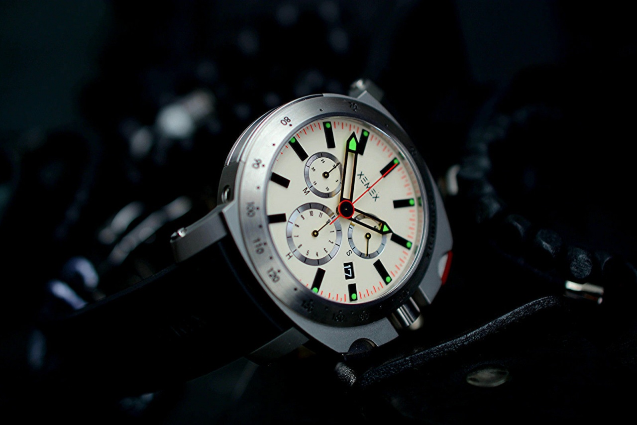 Кнопки хронографа крупные, функции хронографа - секунды, минуты и часы, ADD и SPLIT. Окно даты на "4 часа".