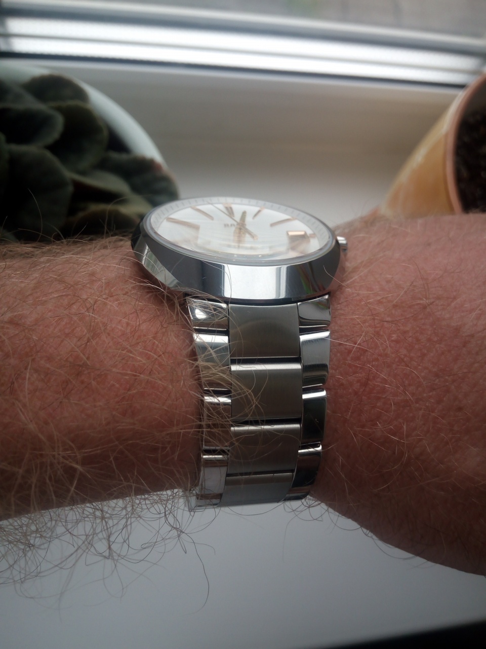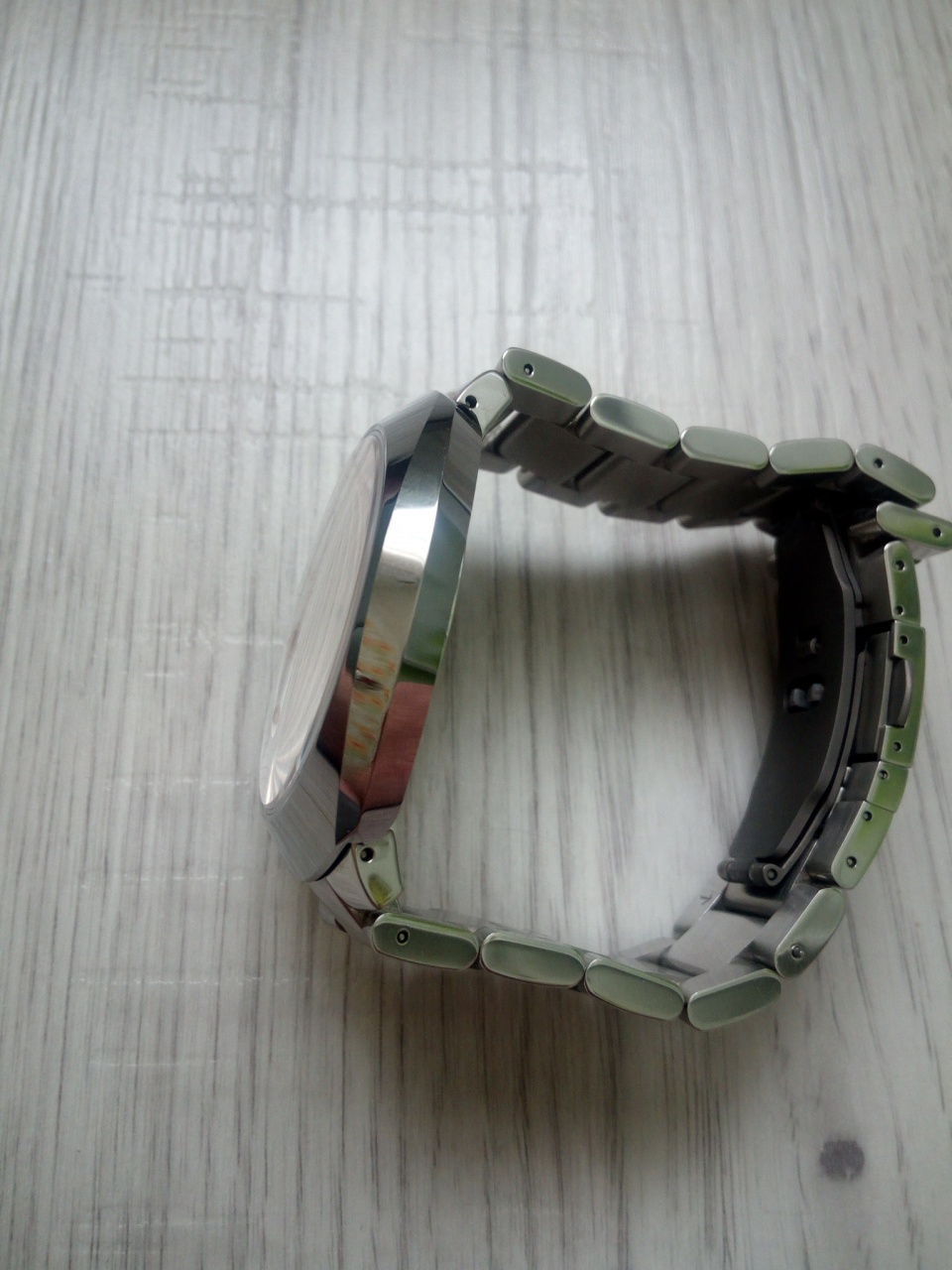Браслет: Нержавеющая сталь (сняты 3 звена, они в комплекте, сейчас на руку примерно 17.5 -18 см), титановая застежка.