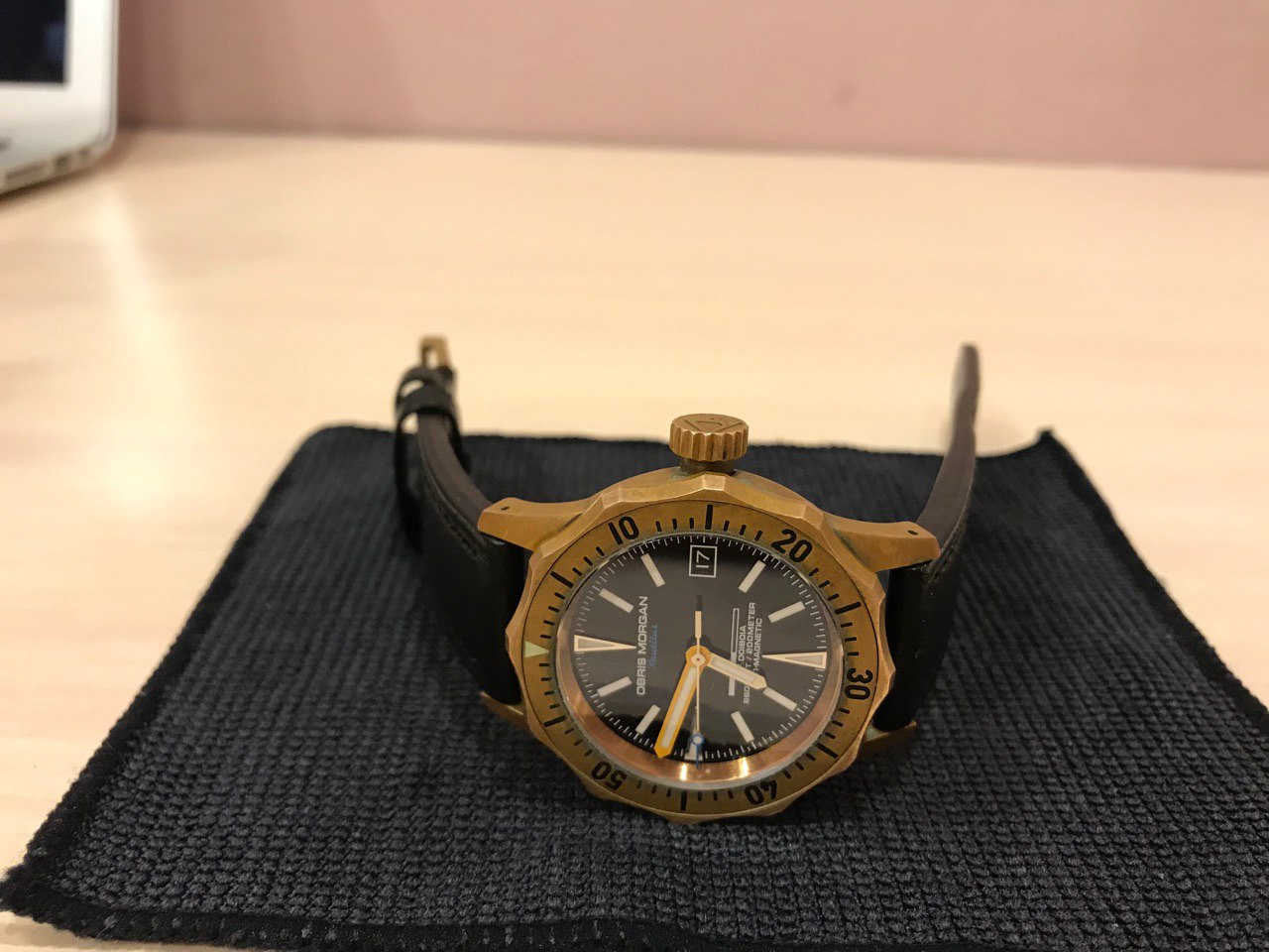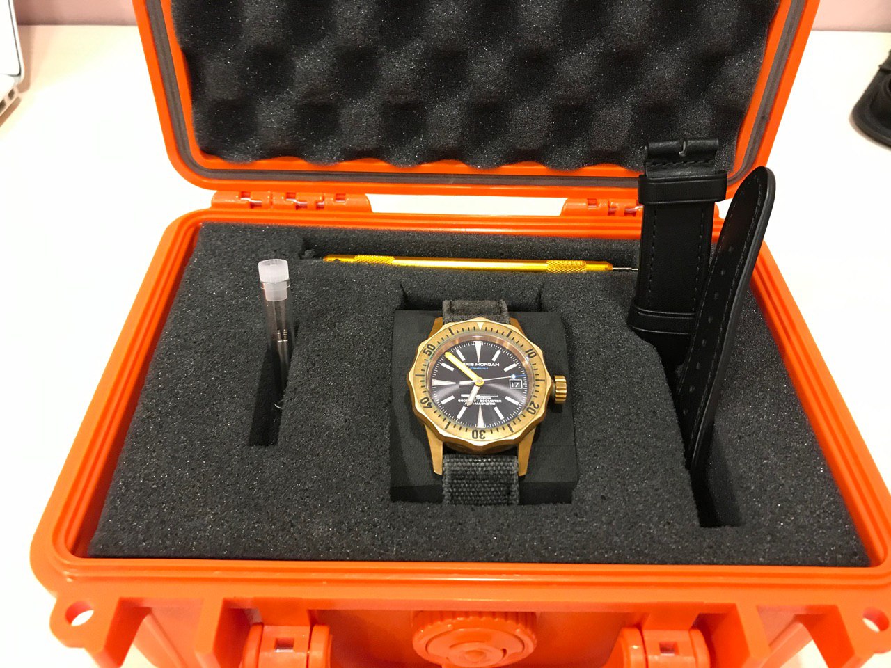 Бронза «правильного» состава CuSn8 (красного оттенка), диаметр корпуса по безелю 41 мм, по самому корпусу — 39 мм и высота 11,2 мм. Механизм — топовая Miyota 9015. Безель на 120 кликов, метки и стрелки покрыты Swiss SuperLumiNova BGW9, циферблат с эффектом солнечных лучей. Стекло сапфировое с антибликом. Водонепроницаемость 200м. Головка завинчивается.