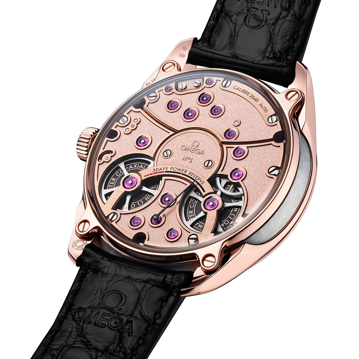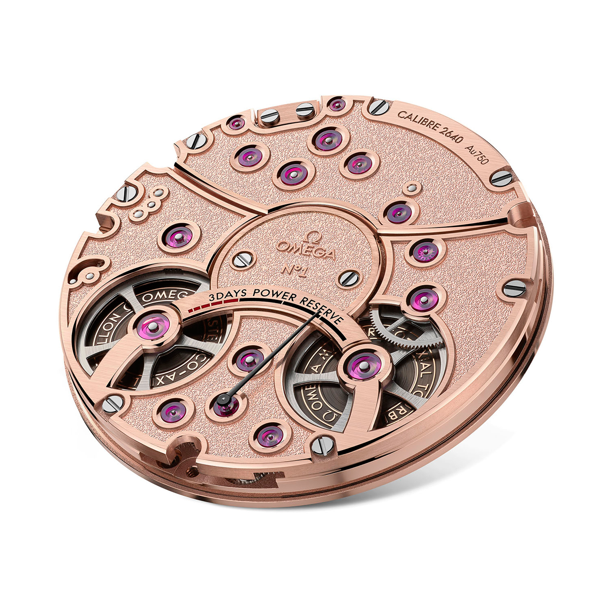 Безусловно жемчужиной новой модели является специально разработанный для неё механизм 2640. Этот калибр с ручным заводом оснащен двумя заводными барабанами, обеспечивающими 3-дневный запас хода, отображающийся стрелкой на задней стороне часов. Коаксиальный спуск и сертификат Master Chronometer говорит о том, что каретка турбийона способна вращаться в магнитном поле до 15 000 Гс с хронометрической точностью. Калибр прекрасно отделан и декорирован, платина и мосты изготовлены из 18-каратного розового золота, фаски отполированы вручную, крупные рубиновые камни окружены полированными золотыми шатонами.