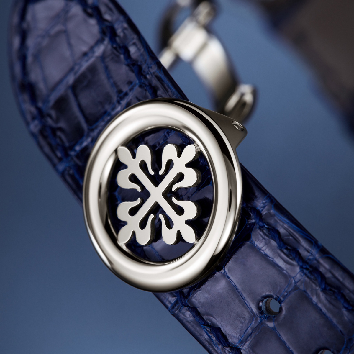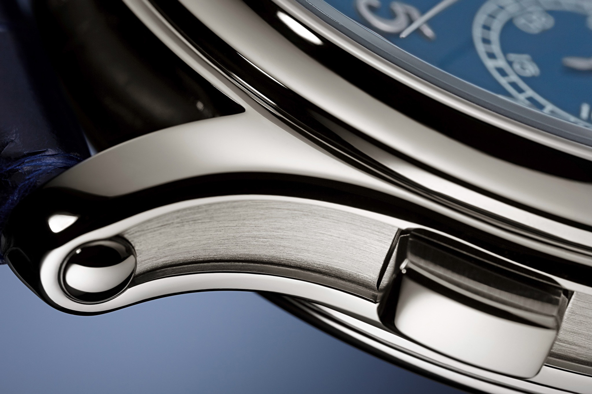 Платиновый корпус часов также впечатляет своей геометрией и отделкой. Вогнутый безель, сатинирование боковых поверхностей и платиновые кабошоны, установленные на торцах ременных ушек, создают завершенный и гармоничный облик корпуса часов. Patek Philippe публикует отличное видео о том, как они создают платиновый корпус для этой модели.