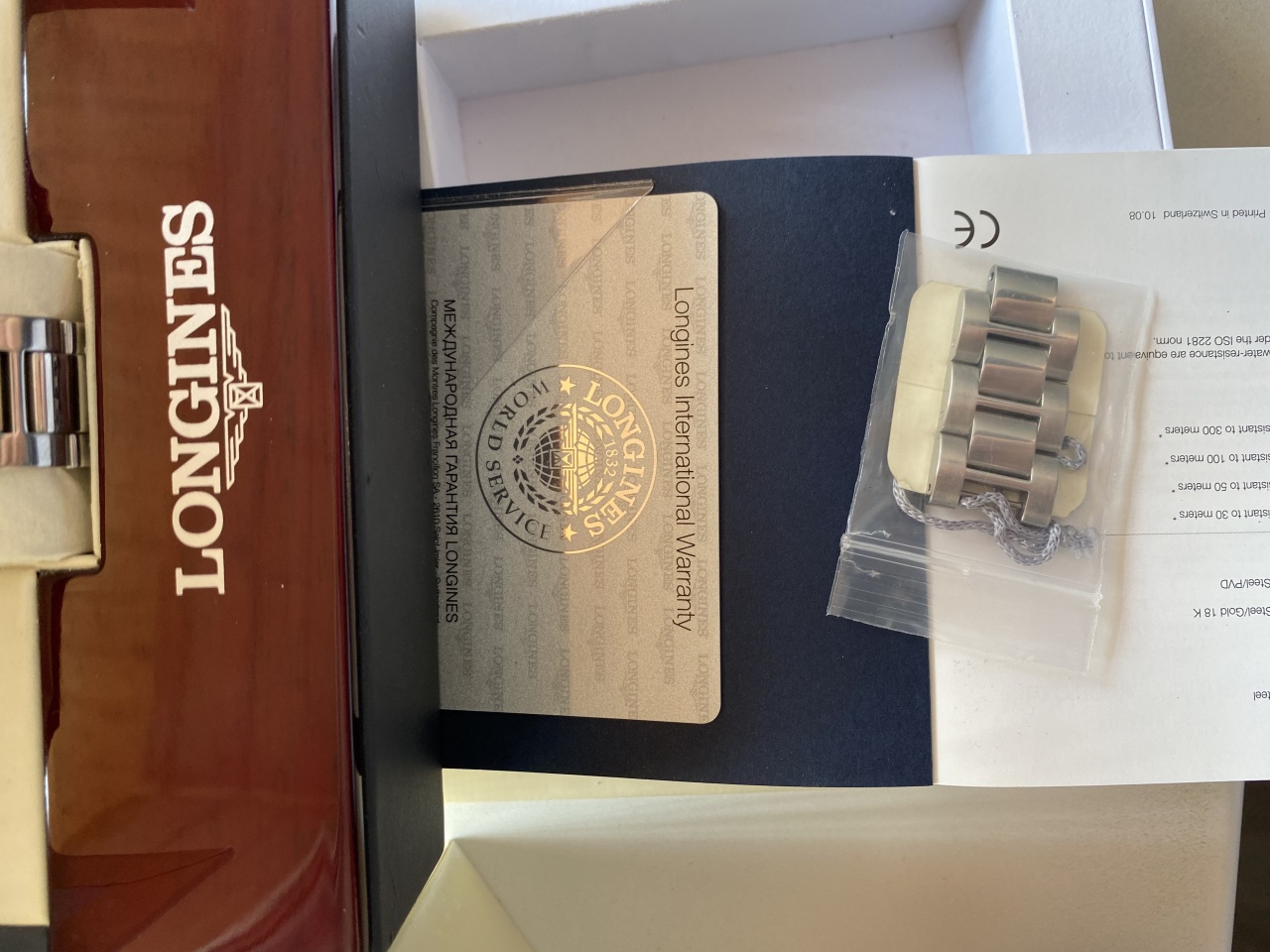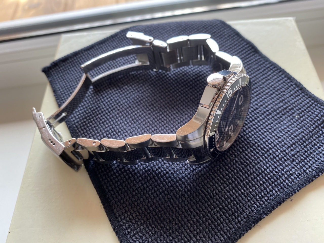 Longines HydroConquest L3.640.4.56.6 в универсальном размере 39 мм с черным циферблатом. Состояние отличное, естественные следы носки - не более того, стекло в идеале. Полный комплект - коробка, книжка, карточка, звенья для браслета все имеются. Часы, судя по гарантийной карточке, покинули магазин в октябре 14 года. Мною куплены у человека в 18 году, как неношеные. Соответсвенно, можно считать, что владелец один. Перед продажей заменил батарейку (разумеется, Renata) и промазал силиконом резинки.