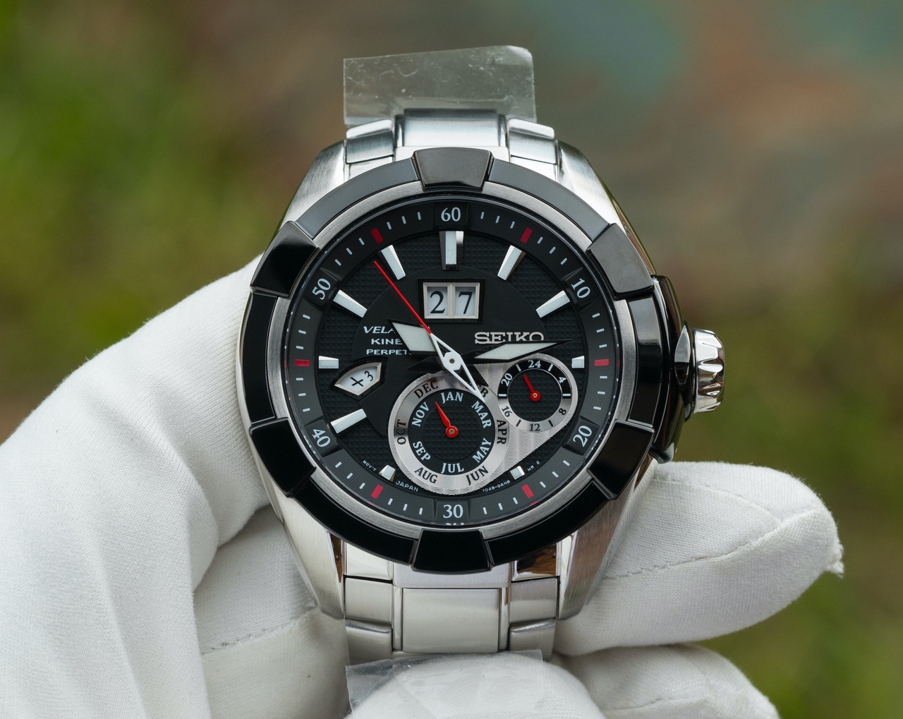 Черный гильёшированный циферблат, метки, окантовка даты и лого SEIKO накладные