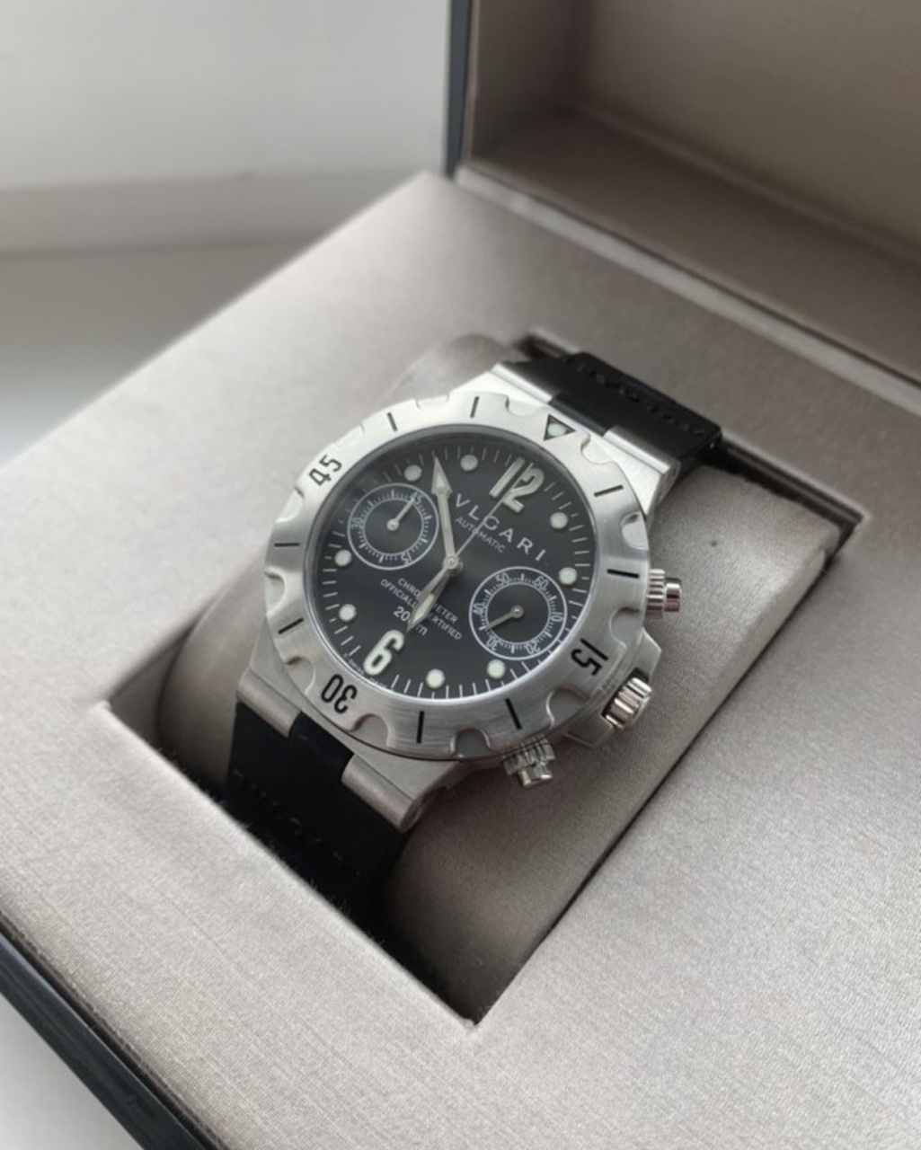 Bvlgari Diagono Scuba референс SCB38S. Часы в отличном состоянии. Комплект включает в себя: часы, лакированную коробку, документы, гарантию, чек о покупке и оригинальный кожаный трэвел бокс.