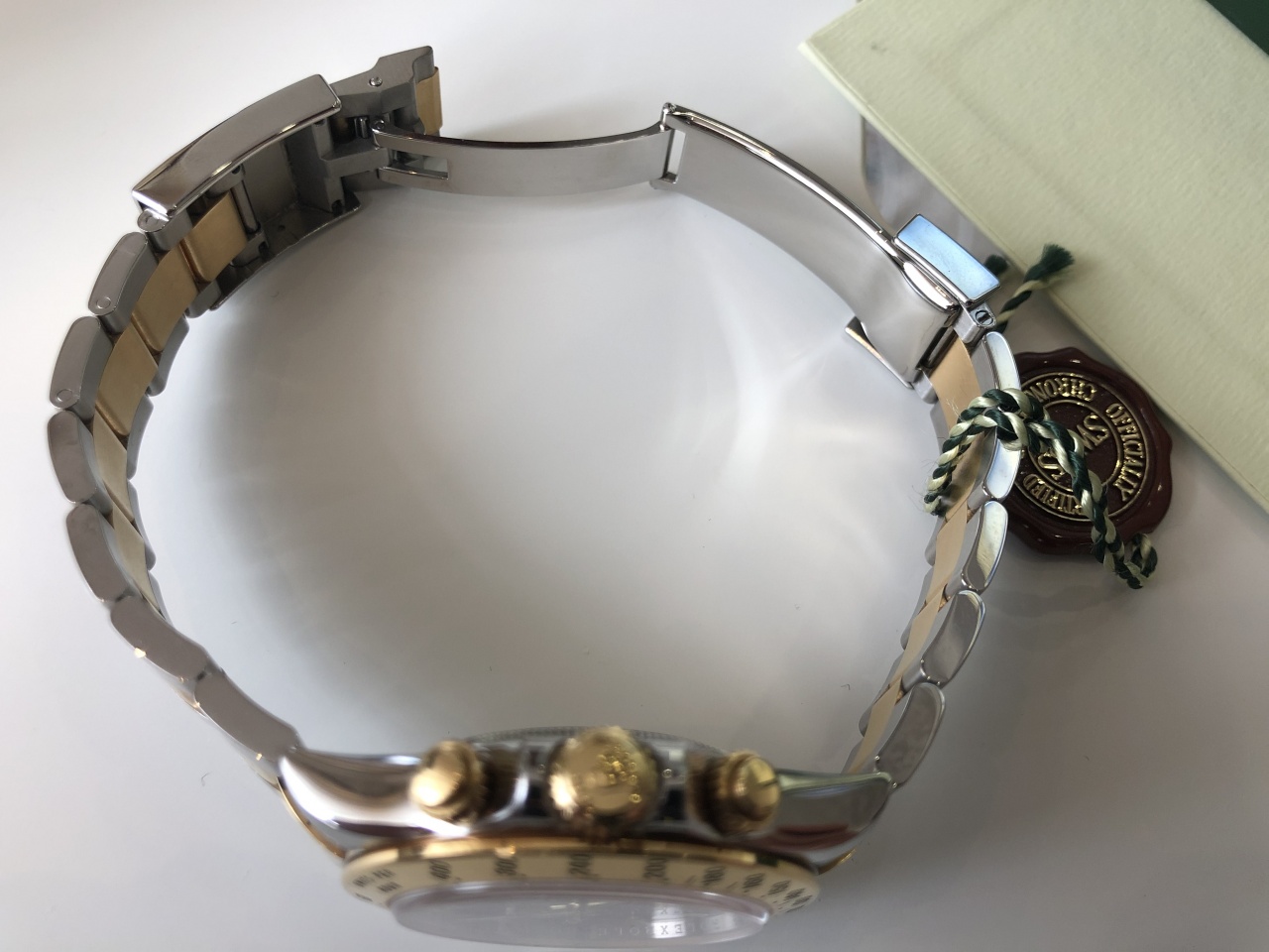 Часы в идеальном состоянии после нескольких носок предыдущим владельцем. Приобретены первым владельцем в ОАЭ в 2010 году. Были подарены настоящему владельцу в 2019. Настоящий владелец часы не носил. Первый владелец не снимал заводские пленки, но на момент публикации объявления они были удалены везде, кроме крышки, т.к. по краям пленок появились небольшие загрязнения мешающие презентабельно продемонстрировать часы. Из документов не хватает книжки