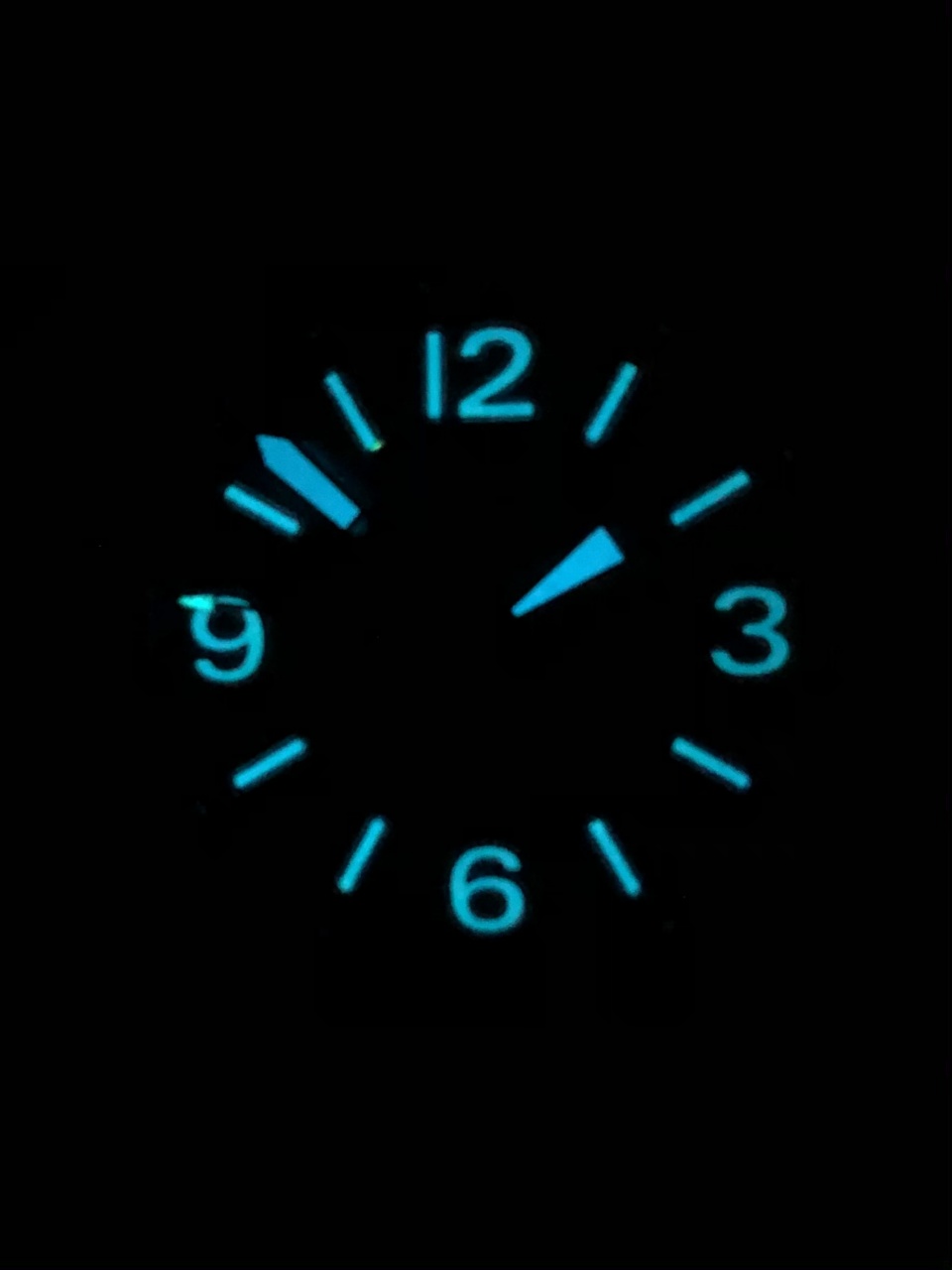 Интересно отделанный циферблат с вертикальной шлифовкой и вырубленными объёмными метками с красивым синим люмом.