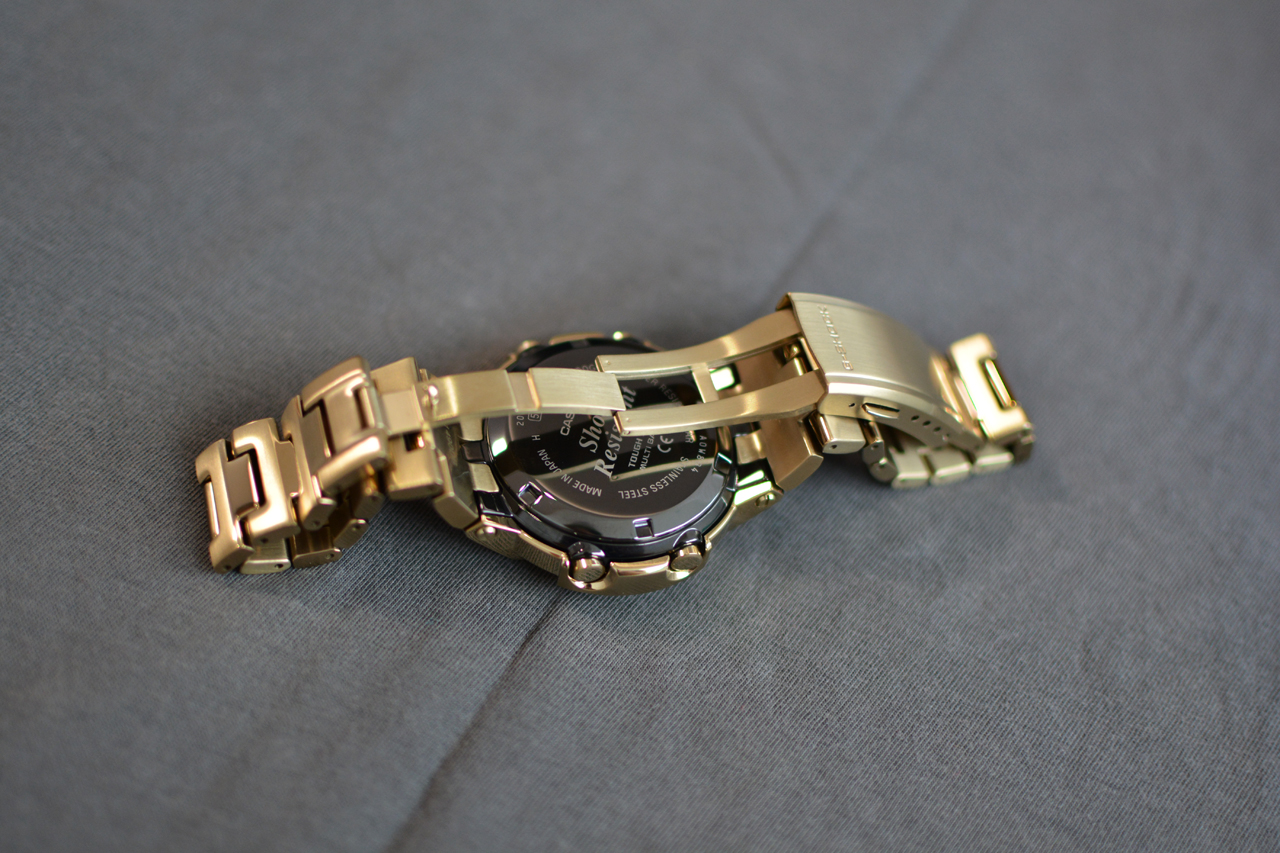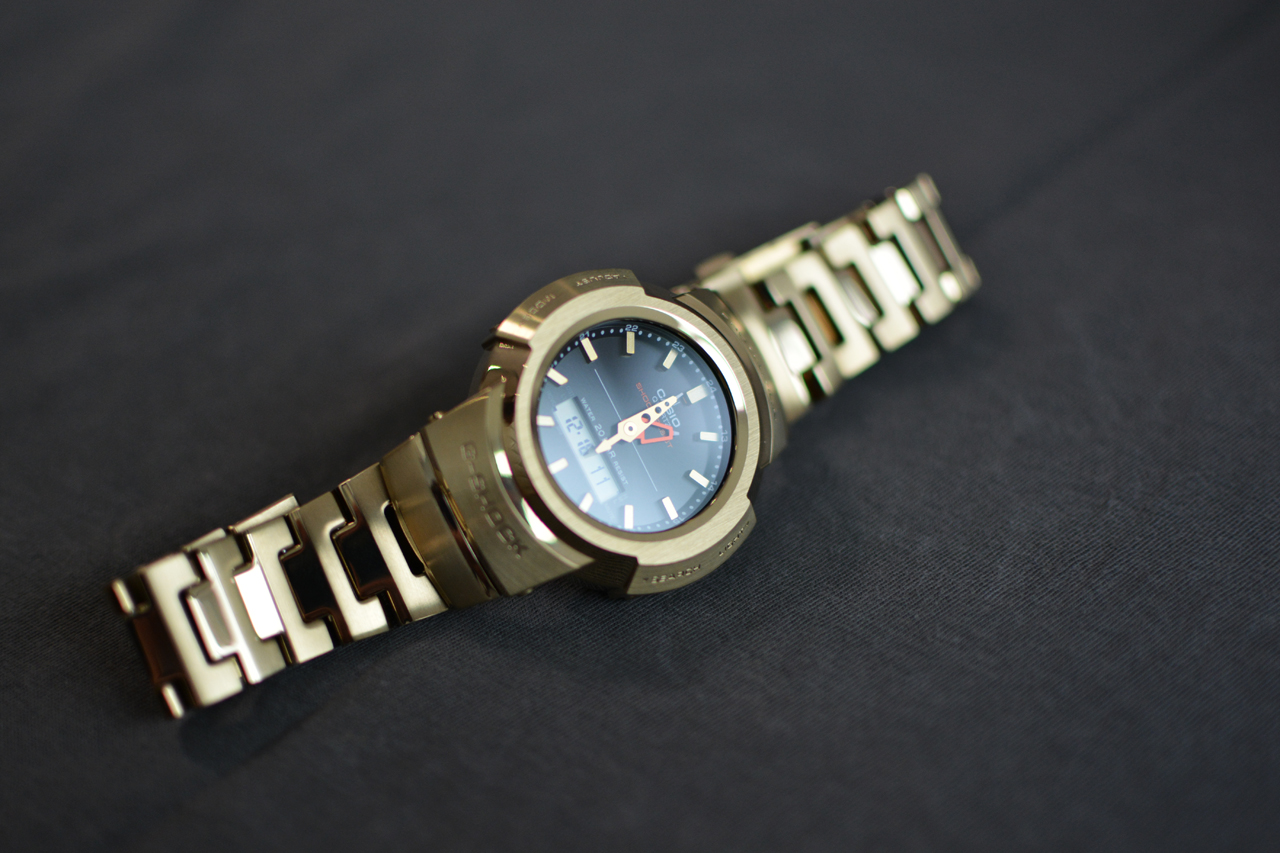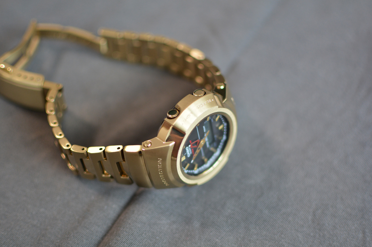 Доброго времени суток, друзья! Наконец-то ко мне приехали мои первые G-Shock из Японии. Заказал их в первые дни после начала продаж, так как очень понравились ещё на этапе фотографий. Данная модель основана на первой комбинированной аналогово-цифровой модели AW-500 от G-SHOCK, выпущенной в 1989 году, они полностью металлические и изготовлены из нержавеющей стали. Задняя крышка завинчивающаяся с DLC покрытием (посмотрю как оно себя покажет). Часы изготовлены качественно, хорошая полировка и сатинирование, браслет литой и застёжка тоже. В часах установлено утопленое минеральное стекло и оно вряд ли поцарапается. Имеется двойная подсветка дисплея и циферблата, но она загорается не плавно как на GWM-B5000. На борту также имеется радиосинхронизация Multiband 6, солнечная зарядка и стандартных набор функций для G-Shock. На сайте Casio пишется, что можно поменять язык отображения дня недели на русский, но я так и не нашёл где его изменить и в инструкции про это ни слова. Немного волновался за посадку часов на руке, так как крайние звенья браслета неподвижны, но оказалось что зря, часы сидят удобно и неподвижные звенья даже не замечаю (рука 17.5). В первые дни привыкал к спокойному, плавному дизайну и размеру часов (51,8 x 44,5 x 14,2), особенно после моих GST W110. Поначалу не верится что это знаменитые противоударные часы: плавные линии, лаконичный циферблат, гордая надпись G-Shock не выделенная краской - идеальный вариант для тех кто хочет одновременно неубиваемые часы и устал от агрессивного дизайна, ступенек и выступов. Я не любитель цыганщины и блестящих погремушек, однако мой выбор пал на золотую версию, особенно после того как увидел в магазине золотые GWM-B5000 - выглядят красиво и совсем не дёшево. Это золотое IP покрытие, предыдущие мои джишоки с IP служат хорошо, покрытие царапается, но не критично. Немного огорчило наличие двух пылинкок на циферблате (практически незаметны), почему-то ожидал полное отсутствие пыли в часах японской сборки, в этом плане часы не отличаются от всех моих предыдущих стрелочных G-Shock.