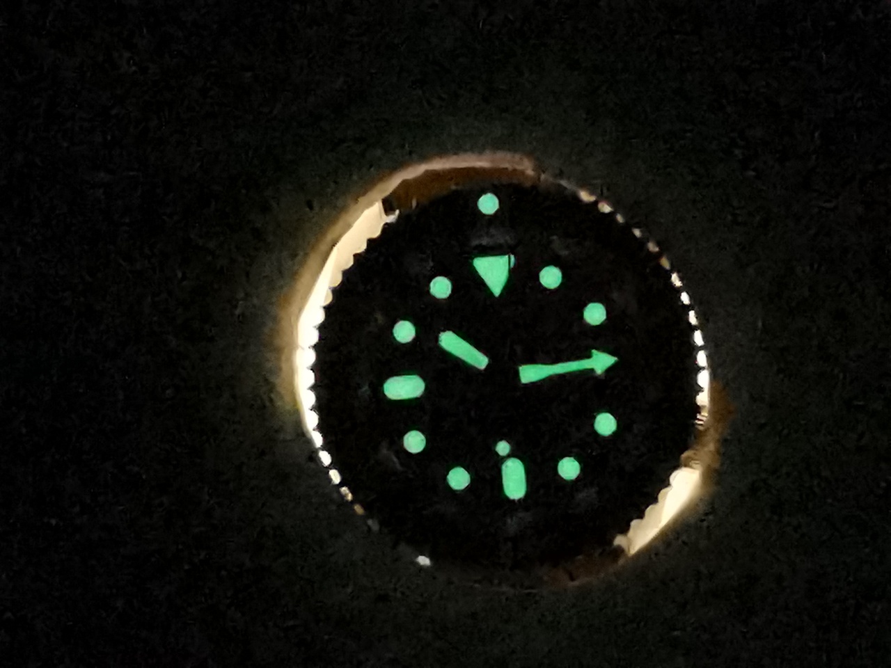 Безель, также как и корпус изготовлен из алюминиевой бронзы. Безель на 120 щелчков, высокий, 4мм,- по гурту нанесены зубчики в два ряда. Движение безеля ровное с небольшим усилием, у него практически нет движения в обратную сторону. Верхняя сторона безеля имеет черную керамическую вставку с нанесенными на нее основными минутными делениями. Деления выполнены в виде углублений заполненных краской светло-желтого цвета, без люма. Выглядит довольно винтажно. На метке соответствующей 12 часам имеется аккуратная жемчужина, с люминофором отличного качества.
