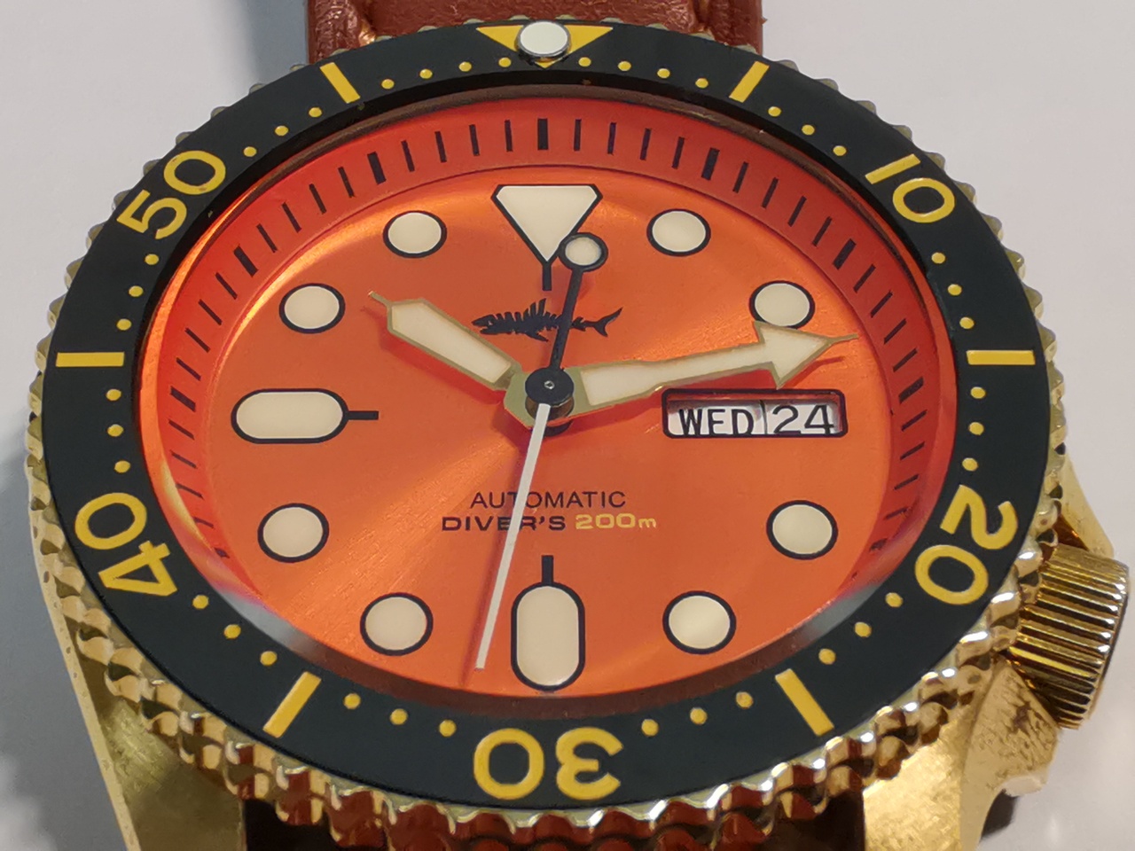 Циферблат оранжевого цвета с радиальным шелковым переливом. На циферблате черной краской нанесен логотип производителя в виде рыбы похожей на акулу, и надписи: automatic, diver's 200m. Окошко даты и дня недели, вытянутой, прямоугольной формы, оформлено черной рамкой. Минутная шкала оранжевого цвета, вынесена отдельным кольцом над циферблатом, создает впечатление значительного подъема.