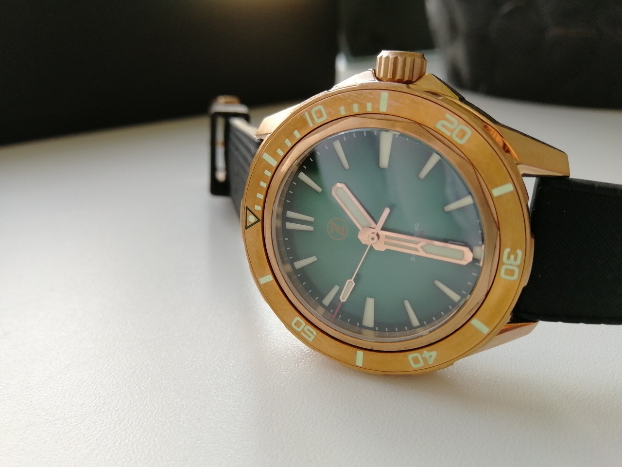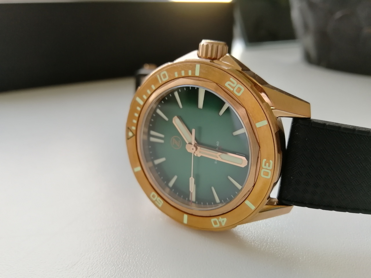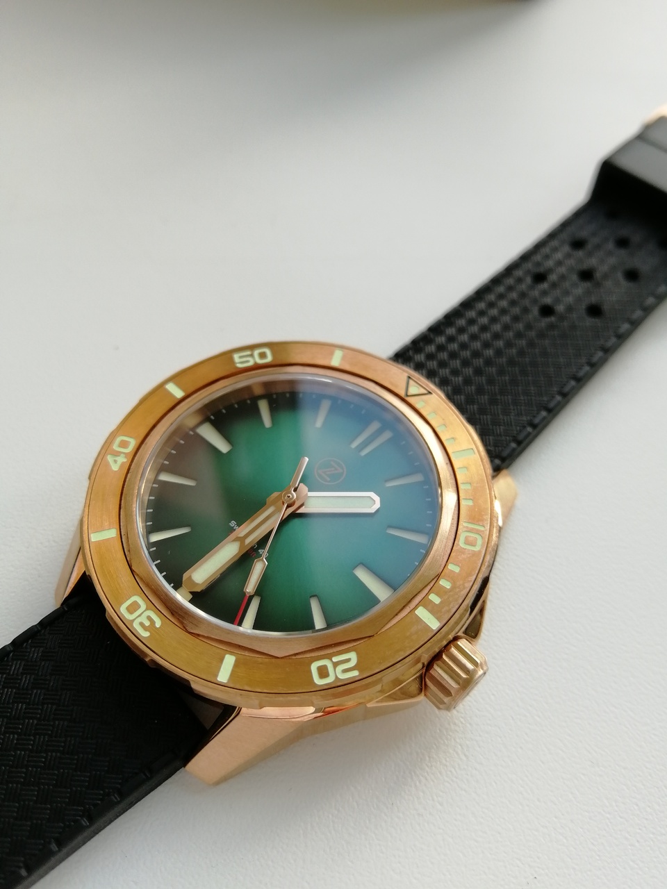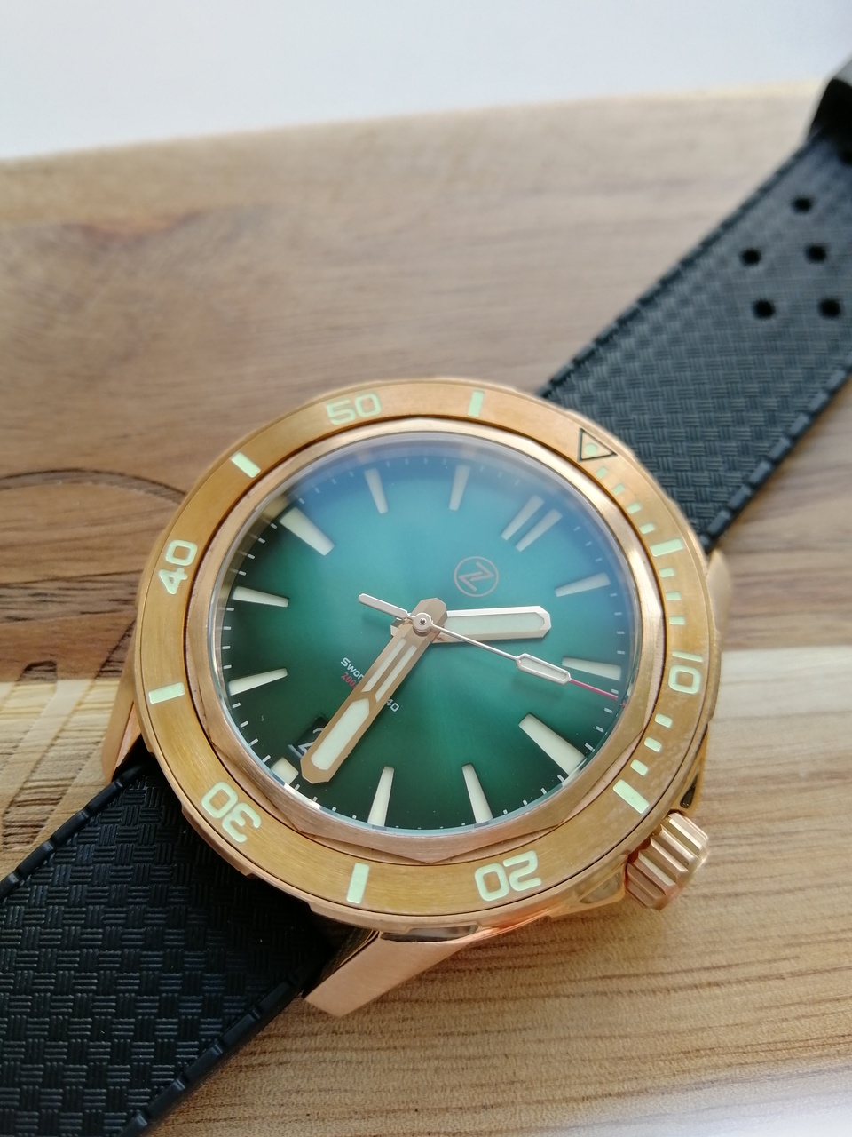 В продаже "правильная бронза CuSn8" от одного из лидеров данного направления - популярного микробренда Zelos. Лимитка из 250 штук, распроданная производителем буквально за пару часов. Часы имеют №65. Шикарный цифер зеленого цвета под сэндвич в живую очень красиво переливается на солнце и вызывает мгновенный "вау эффект". Люм заслуживает отдельного упоминания - супер яркий и долгий, светит как прожектор! Под капотом надежный и проверенный временем NH35A от Seiko. Приятно щелкающий поворотный безель на 120 кликов. Полный комплект: деревянный сундук, клатч для переноски и ремешков, бронзовая гарантийная карта, действующая с апреля 2021 года.