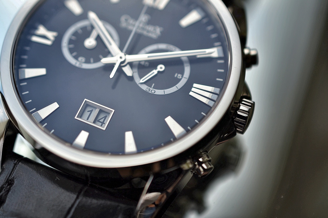 Часы на черном кожаном ремне шириной 24 мм, раскладывающаяся застежка с логотипом.