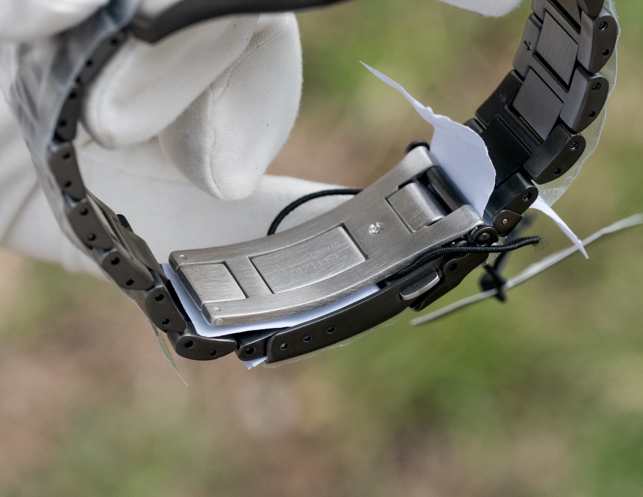 Стальной корпус в стойком ионном покрытии, с сатинированием, выступы для защиты заводной головки