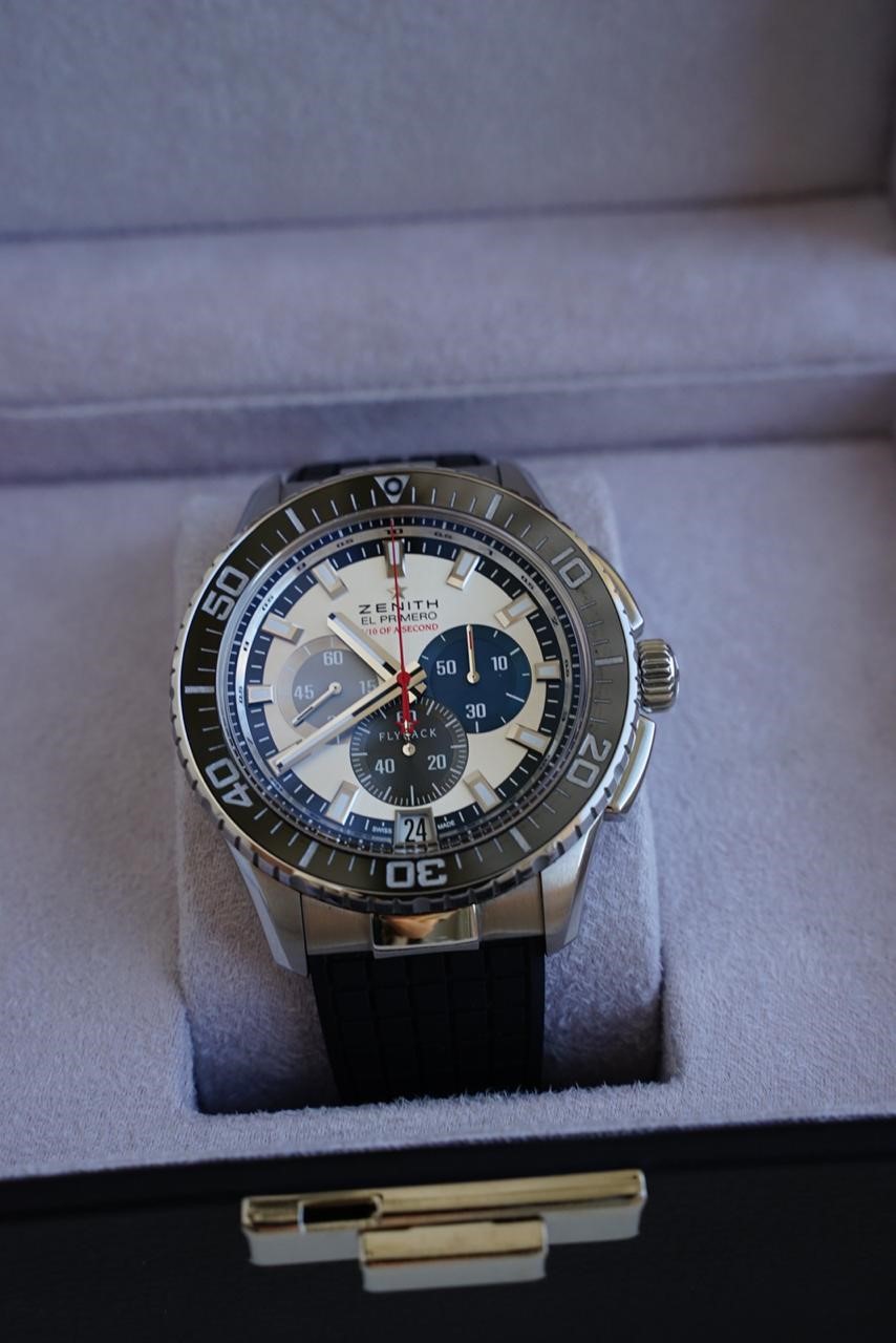 Первые часы, преодолевшие звуковой барьер на границе открытого космоса. Эксклюзивный индикатор десятых долей секунды: стрелка хронографа совершает один оборот за 10 секунд. Задняя крышка с логотипом проекта Stratos и девизом Феликса Баумгартнера. Корпус вращающийся в одном направлении ободок из стали с диском из черной керамики. Циферблат серебристый, с отделкой гильоше «Солнечные лучи» и счетчиками трех разных цветов. Метки и стрелки фасетные, из родия, с люминесцентным покрытием Superluminova SLN C1. Механизм El Primero 4057 B, автоматический, диаметр 30мм, толщина 6,6 мм, 326 деталей на 31 драгоценном камне с частотой баланса 36000 полуколибаний в час с запасом хода 50 часов. Ротор с отделкой «Côtes de Genève». Центральные часовая и минутная стрелки. Маленькая секундная стрелка на отметке «9 часов». Индикатор даты на отметке «6 часов». Хронограф с функцией Flyback и индикацией десятых долей секунды: 60-минутный счетчик на отметке «6 часов», 60-секундный счетчик на отметке «3 часа», индикация десятых долей секунды осуществляется стрелкой хронографа. Ремешок из каучука.Тройная раскладывающаяся застежка из стали.