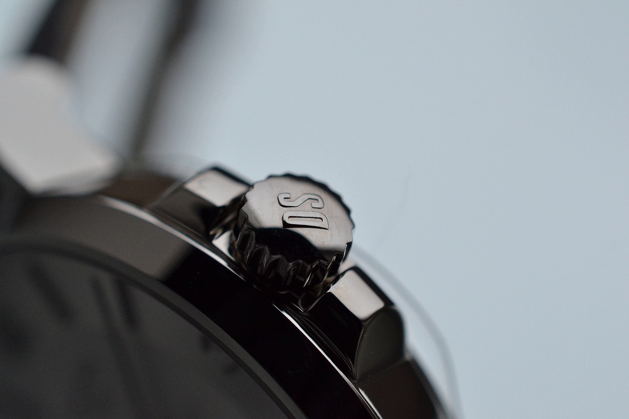 Часы на черном кожаном ремешке, шириной 21 мм.