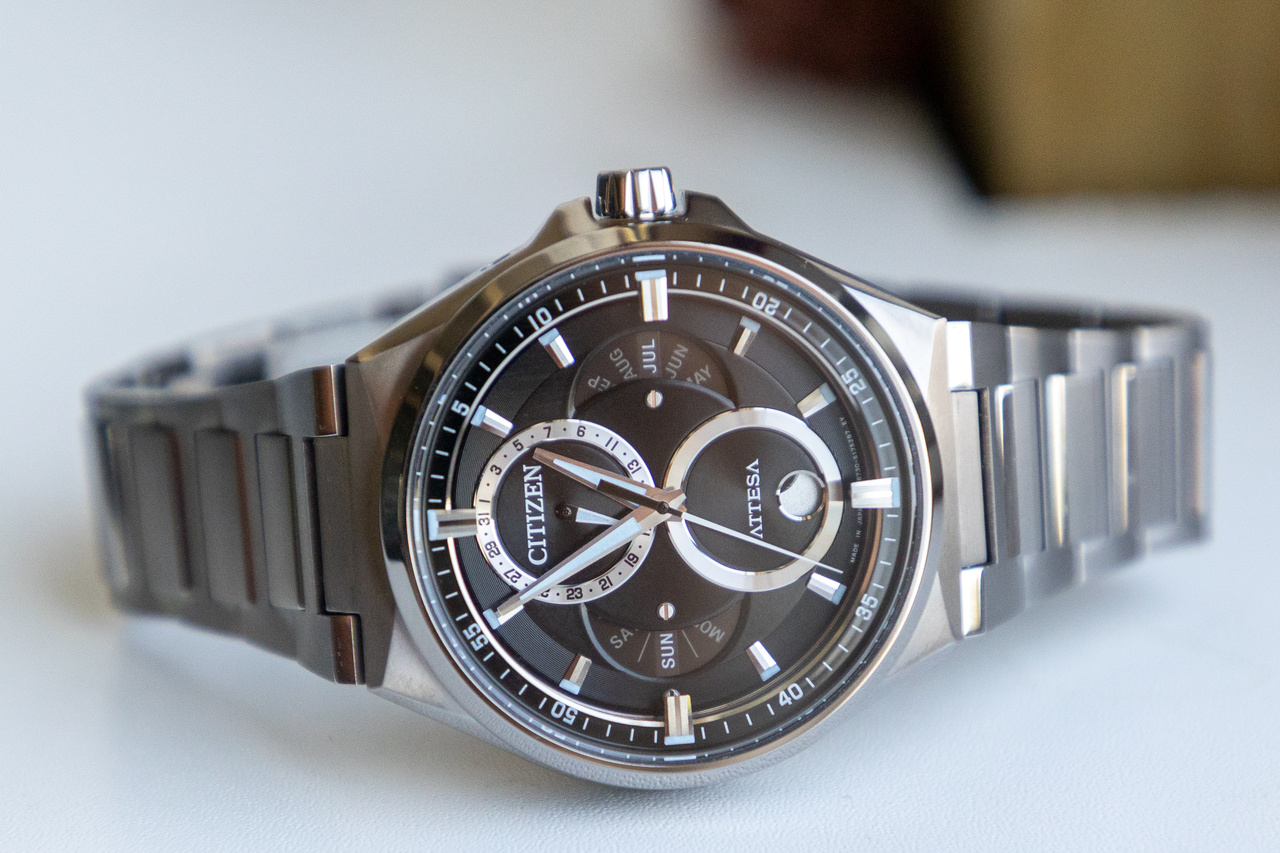 В соответствии с разнообразием деловых стилей в линейке «ACT Line» появилась модель, оснащенная тройным календарем и указателем фаз Луны, которую можно использовать как в костюмном стиле, так и в стиле кэжуал. Возрождая логотип бренда «ATTESA» на циферблате, мы стремились к привлекательности и ценности, которых нет в существующих моделях.Используя механизм «Ring Solar», который имеет солнечный элемент на внешней окружности знака в эко-приводе, мы реализовали многослойную структуру с глубиной и персональным циферблатом.