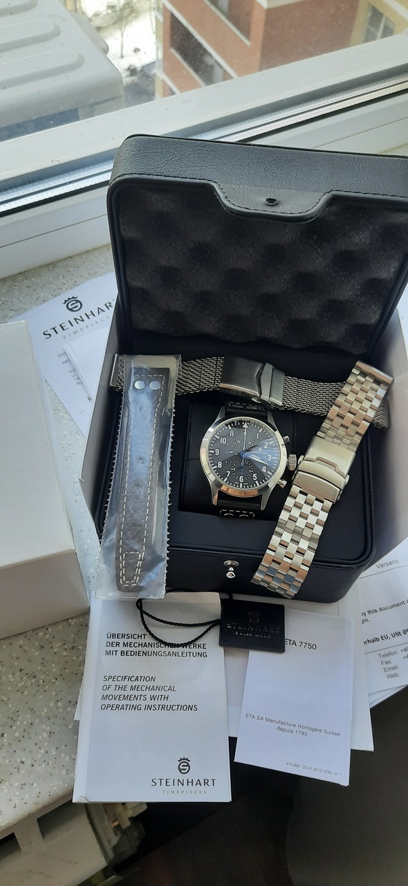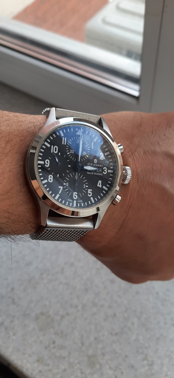 Часы для пилотов Nav B-Chrono II – это первый хронограф, созданный STEINHART на основе надежного и проверенного автоматического механизма ETA VALJOUX 7750. Эта модель, дополняющая серию часов Nav.B, выполнена в великолепном корпусе из нержавеющей стали с полированными поверхностями и крупной “исторической” заводной головкой в форме бриллианта.
