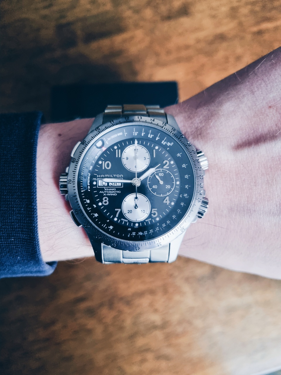 Замечательный хронограф от Hamilton на базе легендарного 7750, который частенько мелькает в кино (на руке Лиама Хемсворта в "Дне независимости: Возрождение", Джеффри Райта в "Мире Дикого запада" и многих других картинах)