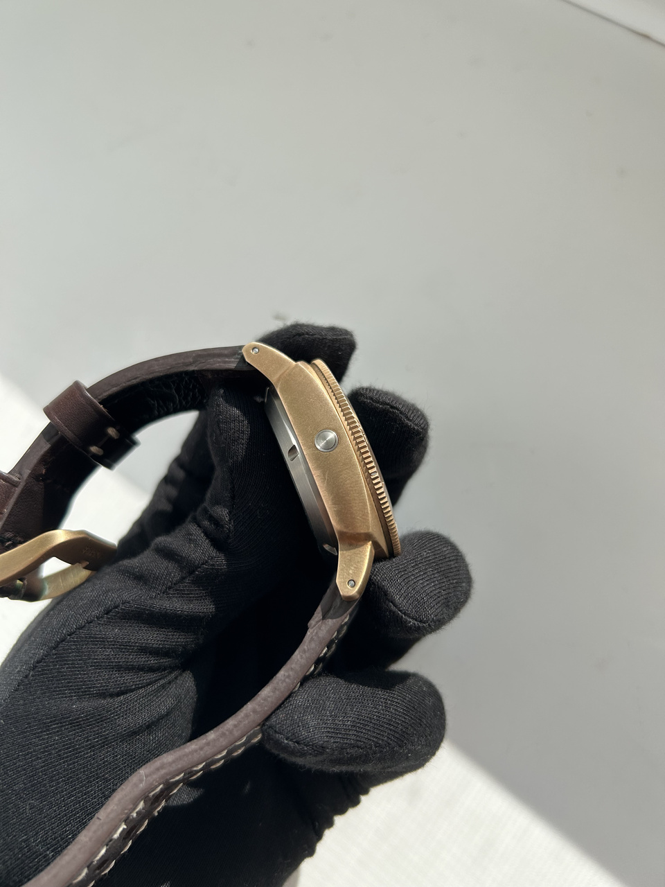 В продаже шикарный и ОЧЕНЬ редкий бронзовый дайвер от легендарного Benarus. Подушка с черным цифером в Пам-стиле из настоящей Cusn8 бронзы, покрывающейся красивой патиной. Корпус 44 мм, не путайте с более простыми моделями с размером 42 мм. В РФ в продаже единственные. В мире встречных предложений не нашел. Часы в отличном состоянии. ЕТА-2824-2, ход точный. Шикарный люм. Титановые заводная головка и задняя крышка. Водозащита 1000 метров. На руке сидят идеально! Кто в теме - тот знает, что это настоящая качественная ОЛДСКУЛ бронза. Установленный кожаный ремешок очень качественный, имеет небольшие следы носки. В комплекте идет новый дорогой оригинальный кожаный ремешок с бронзовой баклей (бакля без язычка, можно переставить с установленного на часах ремня). Полнейший комплект.