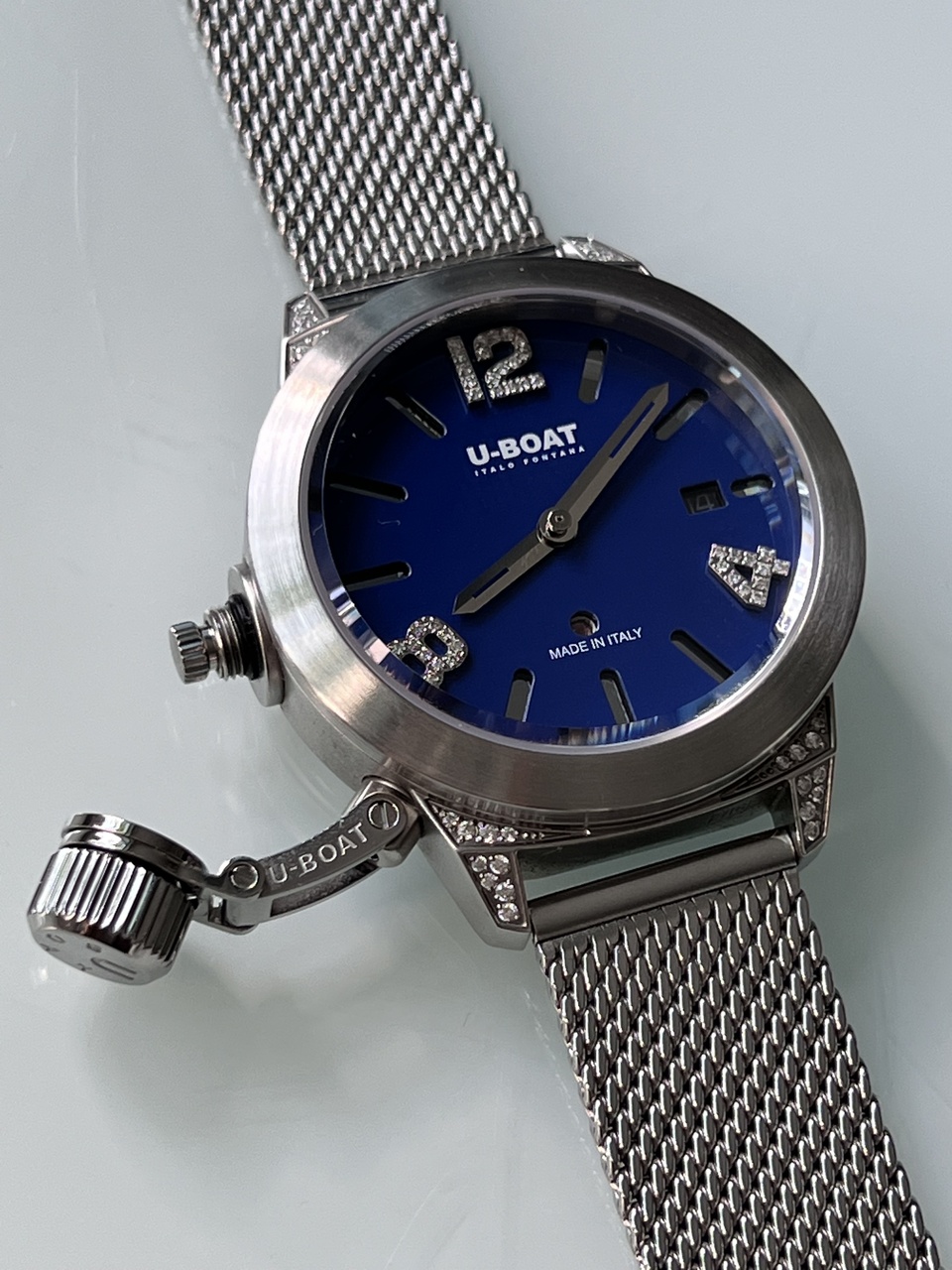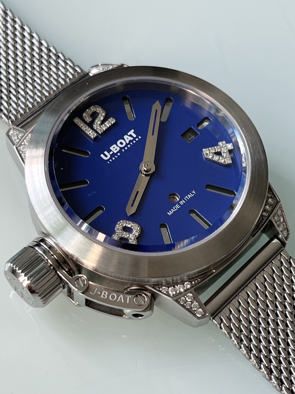 Корпус инкрустирован 20 белыми бриллиантами на ушках (wsi 090) и на циферблате цифры 12, 4 и 8 инкрустированы 43 бриллиантами.