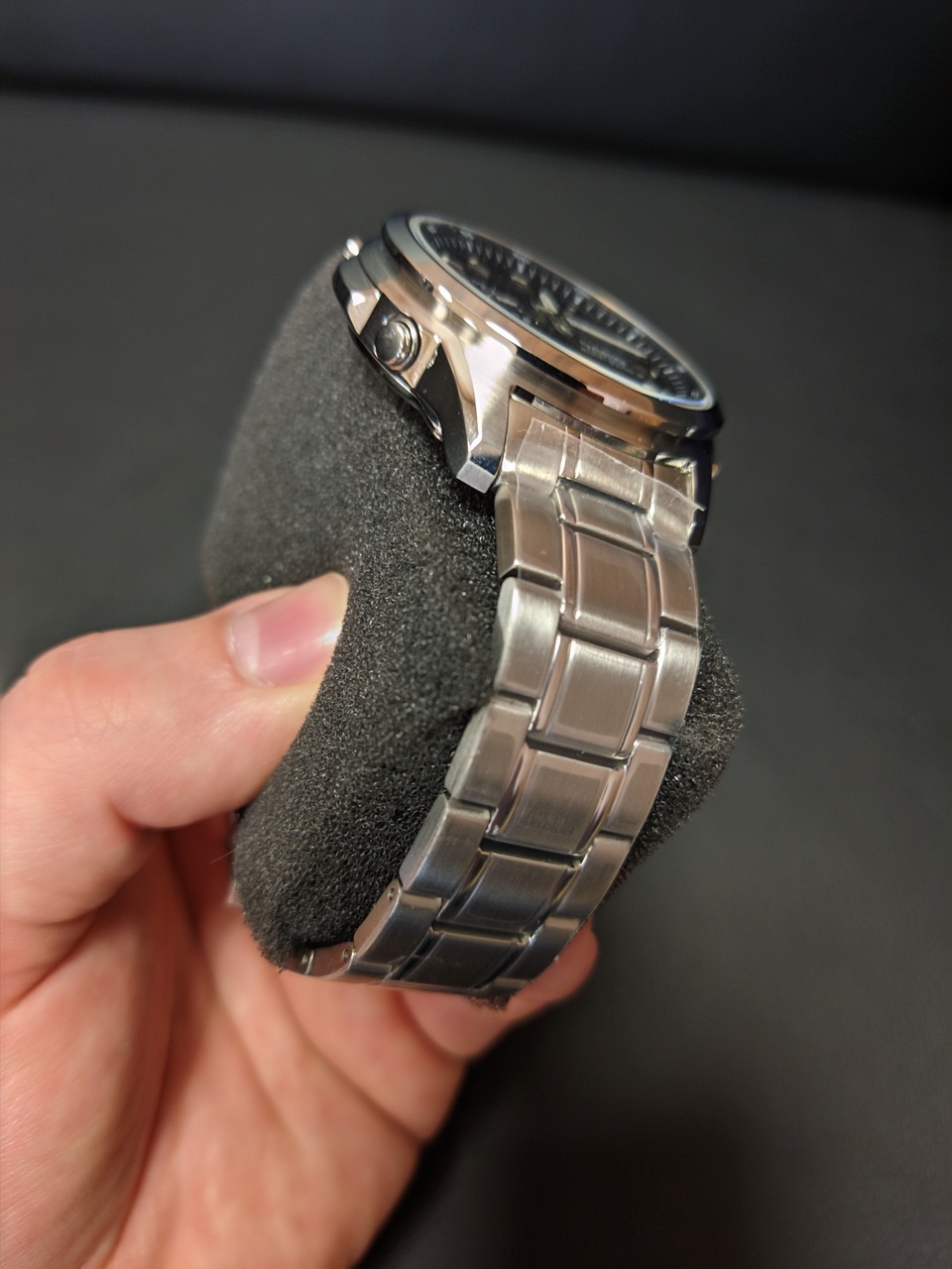 Отличительная особенность модели - гильошированный циферблат, гильоше в виде вертикальных полос нанесено на саму солнечную панель, что я никогда не встречал даже на гораздо более дорогих часах.