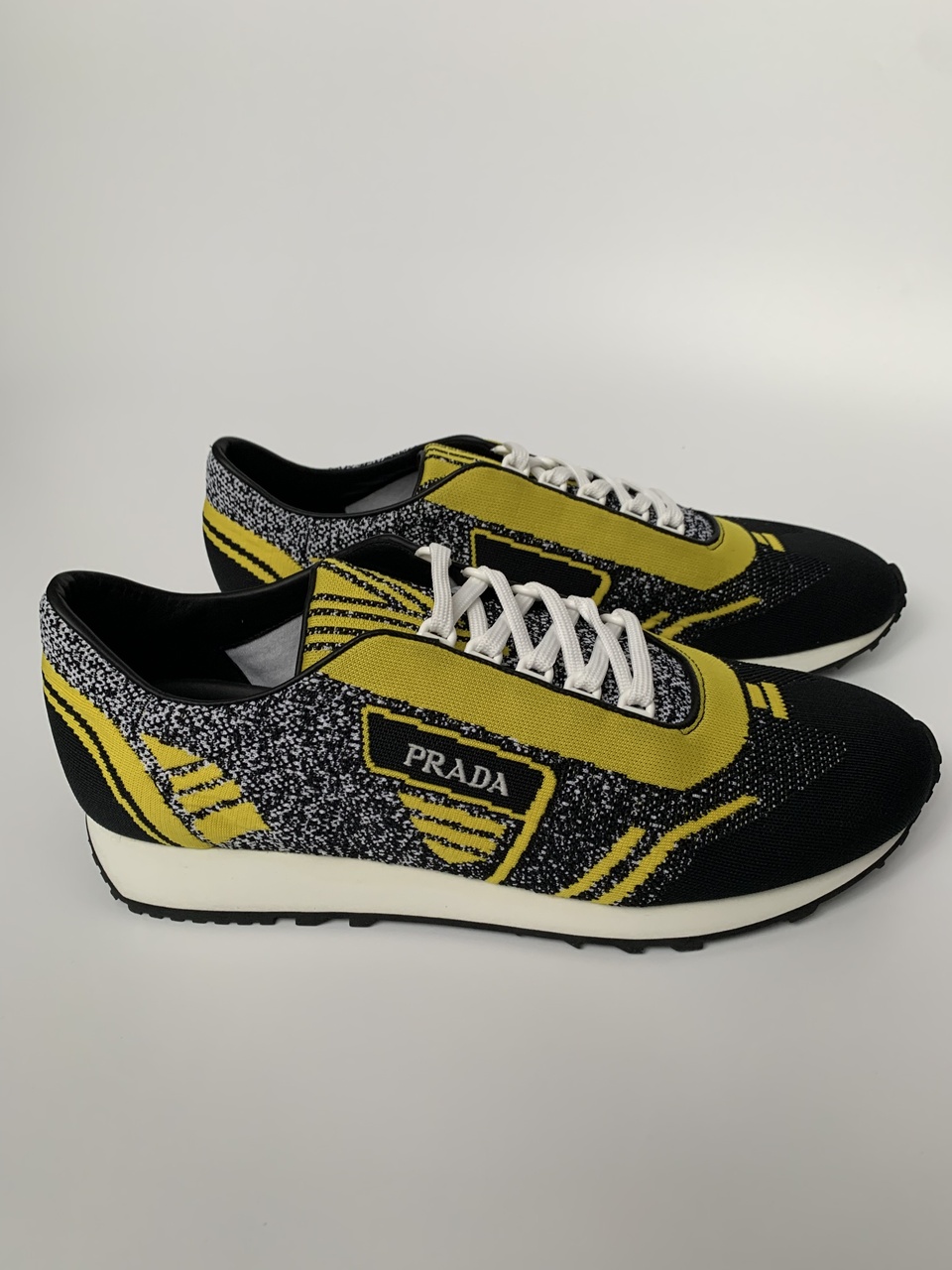 При создании мужских коллекций дизайнеры PRADA фокусируются на моделях,которые никогда не выходят из моды,но при этом всегда остаются актуальными и вписываются в любой гардероб.Данная обувь-не исключение.Это сочетание технологичных материалов,мастерского пошива и богатой цветовой палитры.Яркий пример-в равной степени элегантные и комфортные кроссовки на шнуровке чёрного,серого и жёлтого цвета.Они имеют закруглённый носок,шнуровку спереди,логотип снаружи,стиль колор-блок,стельку с логотипом и плоскую резиновую подошву.