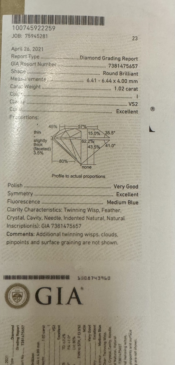 В продаже кольцо с бриллиантом 1,02 карата (сертификат GIA)!