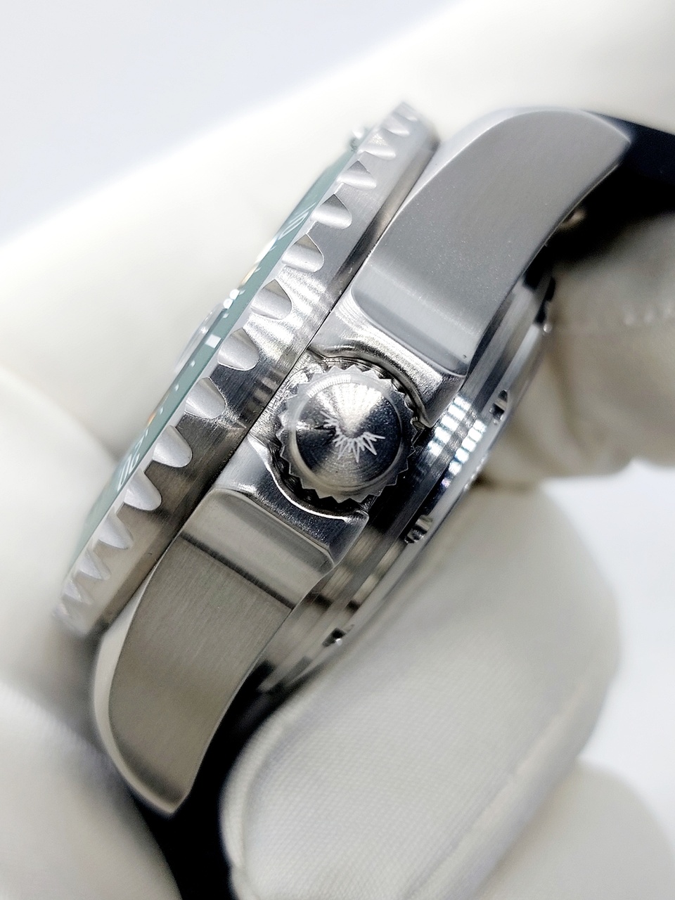 Однонаправленный рифленый безель на 120 щелчков из нержавеющей стали украшен матовой керамической полосой зеленого цвета с минутными метками.