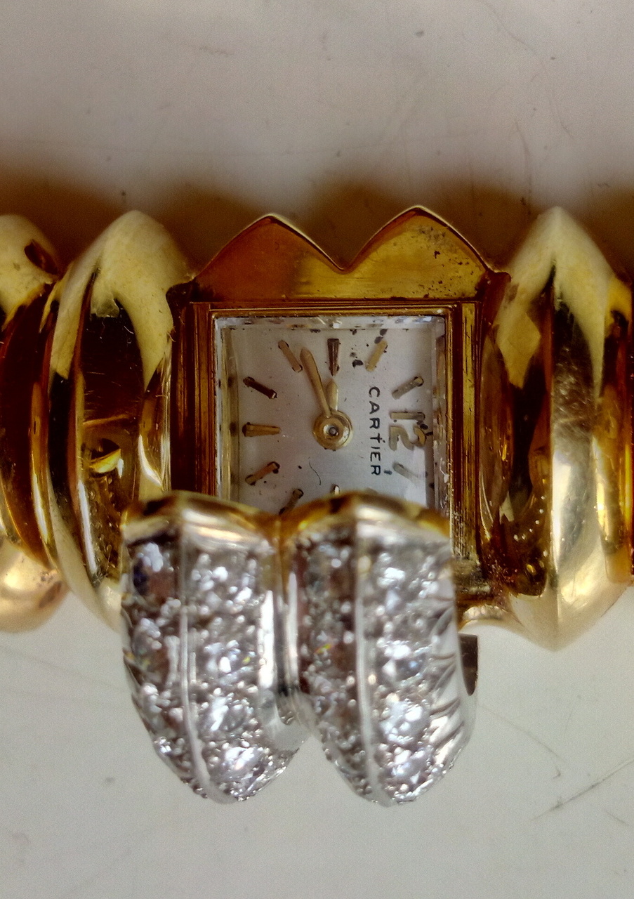 Винтажные часы – браслет Cartier. Сделаны в 50- 60 х годах. Часы механика полностью исправны. Золото 750 проба, Бриллианты , общий вес 87 г. (вместе с механизмом). Хороший экземпляр в коллекцию. Часы этой серии были популярны, но выпущены не большим тиражом, некоторые экземпляры есть на западных аукционах, цена на них начинается от 15 000 долларов. (скрин с предложением, смотрите в фото)