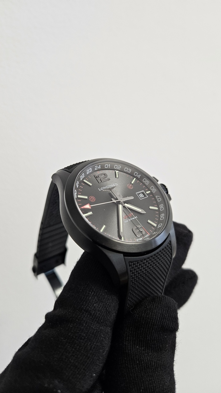 Механизм: В механизме использована технология V.H.P., разработанная ETA специально для Longines, которая обеспечивает повышенную точность хода часов, а также системы автокорректировки показаний после ударов (до 500 g) и воздействия магнитного поля. Антибликовое покрытие стекла, корпус - черное PVD-покрытие, завинчивающаяся задняя крышка. Второй часовой пояс в 24-часовом формате времени