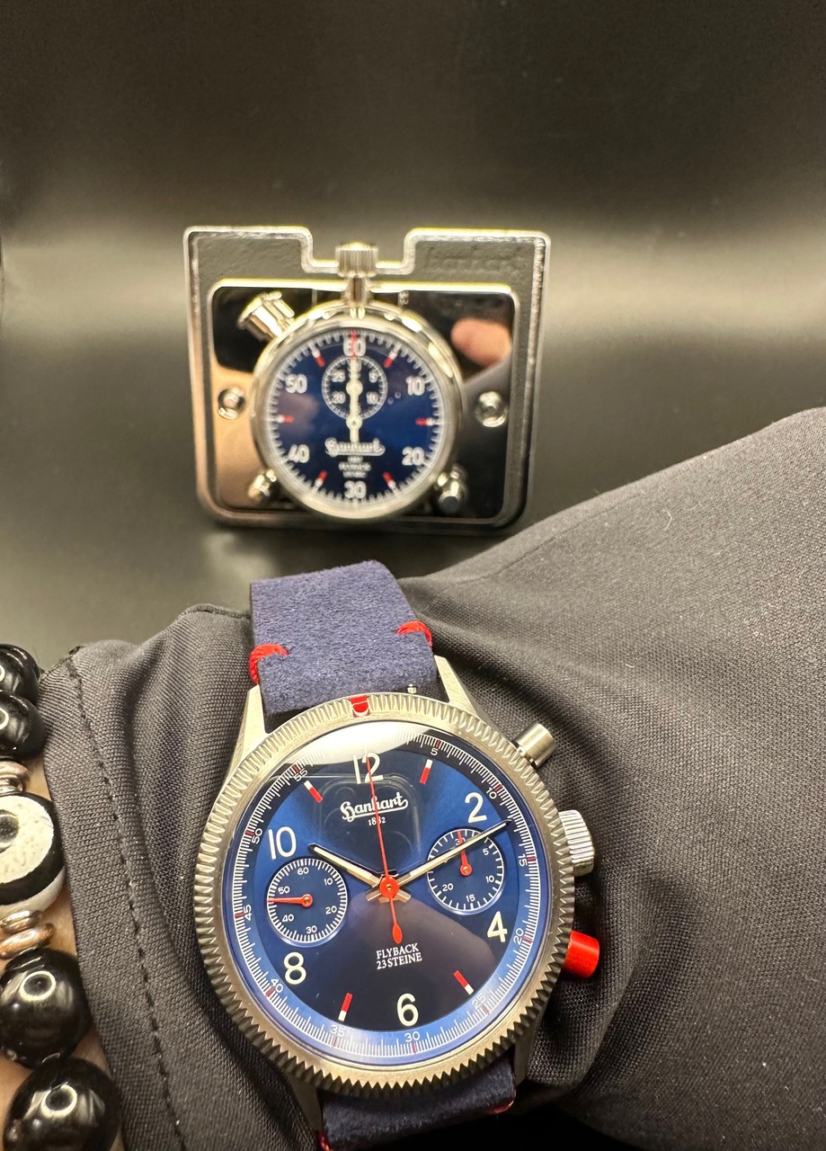 Продаются необычайно красивые и редкие часы в комплекте с секундомером от немецкого производителя пилотских хронографов Hanhart Chronographen 1882, который уже 140 лет производит часы и секундомеры.