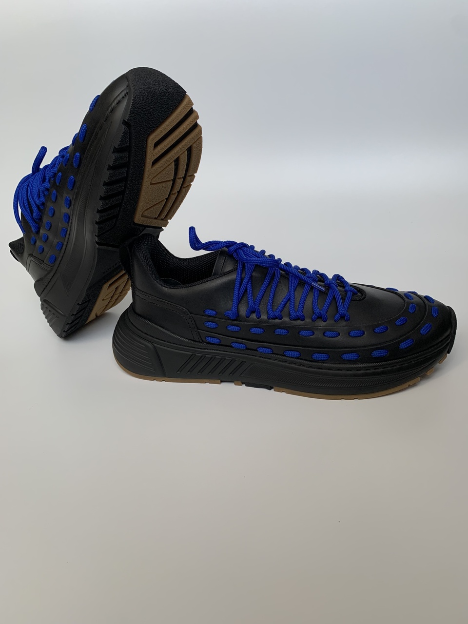Чёрные кроссовки не выглядят просто благодаря шнуровке оттенка синий электрик и двойному стичингу ей в тон.Обувь изготовили из гладкой матовой кожи растительного дубления,поэтому она получилась особенно мягкой и эластичной.
