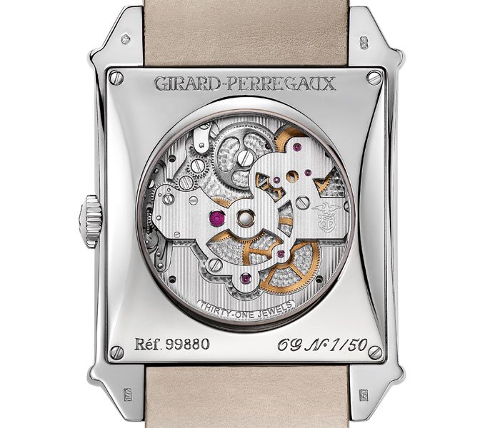 Модель оснащена автоматическим механизмом Girard-Perregaux 9600C, состоящим из 257, длиной 30,30 мм, шириной 28,60 мм, толщиной 6,25 мм, на 31 камне, с балансовой частотой 21600 полуколебаний в час (3 гц), микроротором автоподзавода, запасом хода 48 часов, функциями индикации часов, минут (посредством центральных стрелок) и секунд (посредством секундной стрели, расположенной на каретке турбийона на 6 часах). Калибр на трех мостах из белого золота, отменно отделан и декорирован согласно критериям Haute Horlogerie (в т.ч. родирование, гильоше, круговое зернение). Турбийон минутный, состоит из 72 компонентов, общим весом 0,3 грамма, диаметром 12 мм.