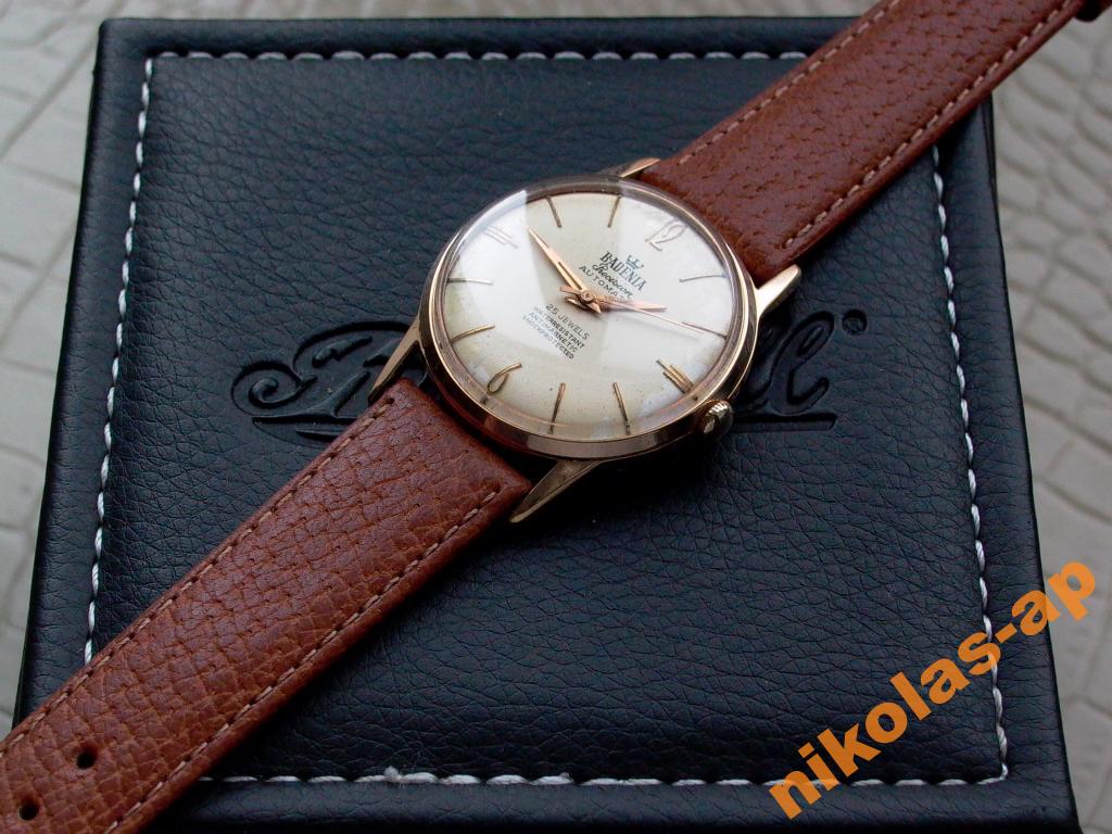 Описание - Швейцарские часы 1960 годов состояние на фото,что видите-то и покупаете. Стекло в отличном состоянии, корпус с Gold покрытием в потертом сост.Задняя крышка нержавейка с клеймами и дарственной надписью на итальянском языке. Циферблат сливочного цвета со следами времени, золотистые стрелки и маркеры. Подписан Badenia Precision Automatic 25 Jewels Waterresistant Antimagnetic Shockprotected"