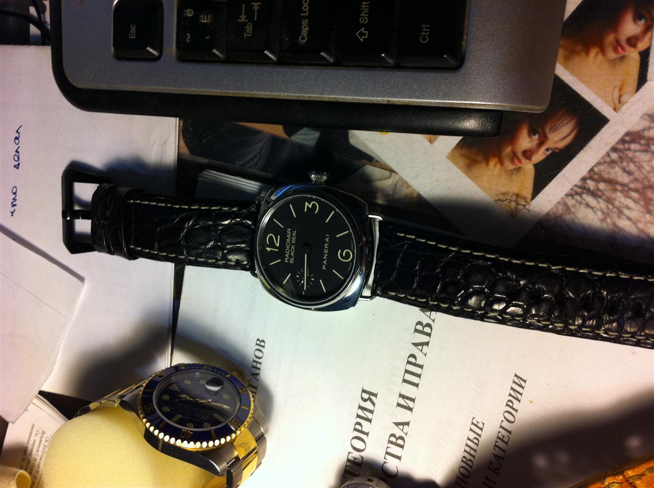 Запоздалый обзор. Так получилось, что к ПАМам я пришел далеко не сразу - считал их несколько грубоватыми и вычурными. До сих пор так считаю, но теперь это не является для меня недостатком Так вот, постоянные читатели ветки знают, что первые ПАМы я подарил. Т.к. хозяин принял волевое решение не выносить часы из дома, пока не починит брутал кар, я одевал их (312) несколько раз самостоятельно, получал все большее удовольствие и все большее ощущение, что ношу чужие трусы. Принял решение со временем, никуда не торопясь, купить и себе такие. Хотел, и почти отобрал у Мсье адвоката его вожделенные 177, но как-то не сложилось. В результате, однажды он позвонил и сказал, что у нас в ДаВинчи лежат 183, которые "надо брать". Пришел в бутик, мерил, долго сомневался (или делал вид) в итоге сошлись в цене - и вуаля, они мои. Первый месяц не снимал их вообще. Это самые красивые ПАМы во всей линейке за всю историю, кмк. Вот они, на классном черном алигаторе с белой строчкой и глянцевой PVD-баклей.