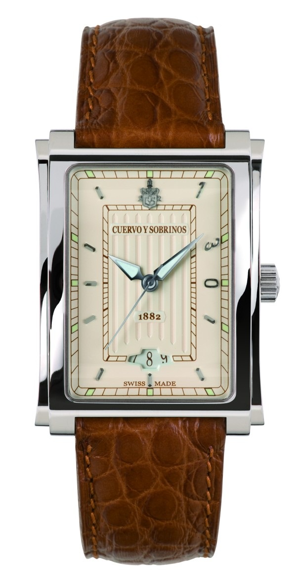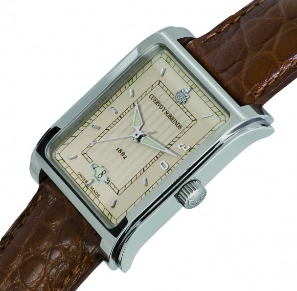 Прямоугольный корпус из полированной стали, длиной 43 мм, шириной 32 мм, водонепроницаемый до 30 метров. Заводная головка, с логотипом бренда на ее торце, на 3 часах. Дважды изогнутое сапфировое стекло с двусторонним антибликовым покрытием защищает циферблат кремового цвета, отделанный вертикальными полосками. На нем расположены накладные часовые индексы, причем на 1, 2 и 3 часах имеются накладные цифры "1", "3" и "0", вместе составляющие число "130", означающее годовщину Cuervo y Sobrinos. Часовая и минутная стрелки с люминесцентным покрытием. Задняя крышка корпуса также прозрачная, с выгравированным номером модели в лимитированной серии.