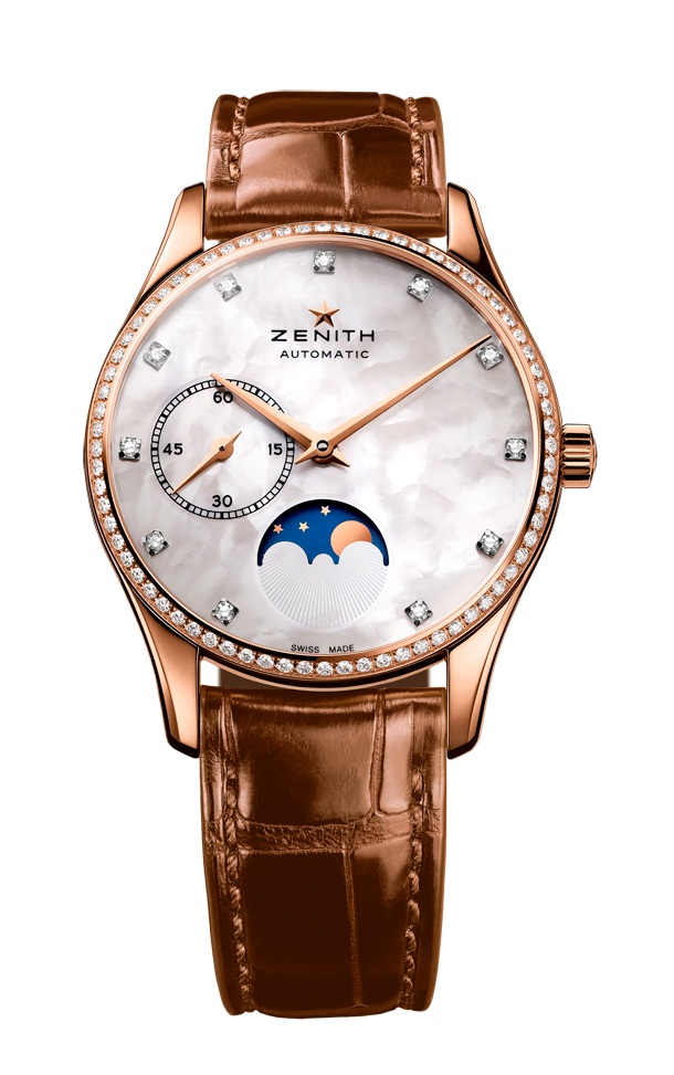 В положении «4 часа 30 мин» находится окошко даты. Мануфактура Zenith предлагает широкий ассортимент версий данной модели (с циферблатом цвета стали или голубого льда; c циферблатом из перламутра; с часовыми метками, украшенными бриллиантами; и даже с металлическим браслетом), среди которых прекрасные дамы смогут выбрать наиболее подходящую им по стилю.