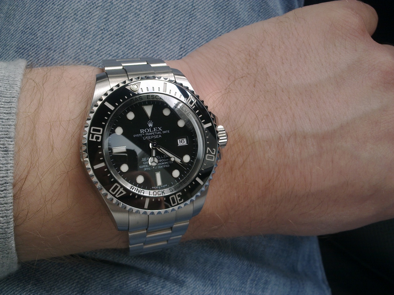 Специально для модели Rolex Deepsea был разработан корпус сложной конструкции с тремя несущими элементами, получивший название Ringlock. Его архитектура может служить образцом технического превосходства Rolex в часовом деле. Начнем с того, что внутри корпуса находится очень прочное кольцо из азотистой нержавеющей стали. Этот опорный каркас выдерживает давление, способное раздавить глубоководный аппарат. Выпуклое сапфировое стекло толщиной 5 мм защищает циферблат и усиливает корпус часов снаружи. Изготовленное из оксида алюминия высокой чистоты, оно способно выдерживать давление груза весом три тонны (примерно такое давление оказывает столб воды высотой 3900 метров). С обратной стороны корпус часов усиливает и плотно герметизирует крышка из титана степени 5.