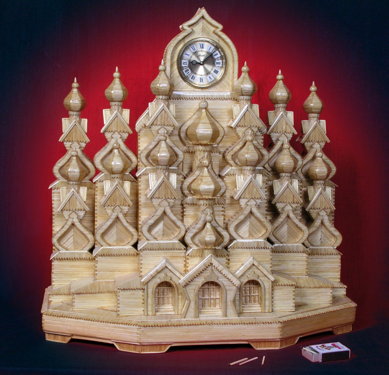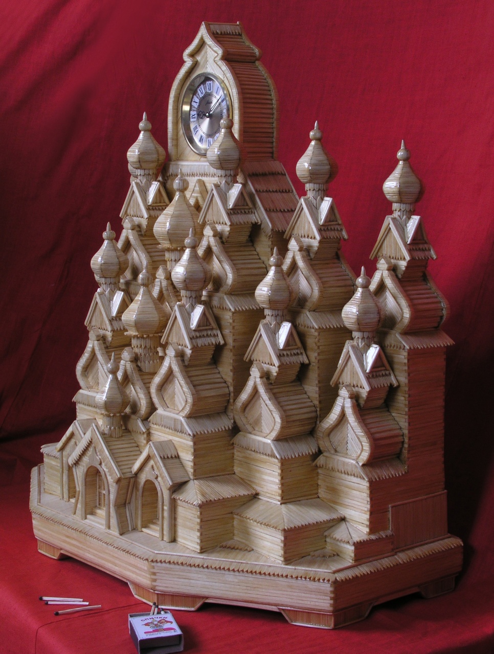 Механические часы "Агат" Златоустовского часового завода, помещенные в эксклюзивный корпус ручной работы, каждая деталь которого собрана из хозяйственных спичек.Корпус изготавливался порядка 3 лет.Размер часов 54х52х25см.Об часах иимеется статья в журнале "Который час"№6,7 2004 год