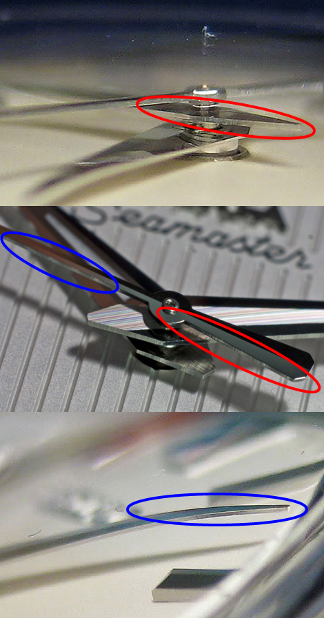 Farang привел фото в разы крупнее с хорошим контрастом, от чего детали повылазили. Я добивался с перевертышем похожего эффекта, когда нашел такие же грани стрелок у своих 300М. Я взял фото и привел их к более-менее схожему масштабу. Причем я уменьшал фото Farang'а, так как качество его фото было в разы выше. После я слегка зашарпил фото ГС, т.к. автор этих фото неумышленно выставил часы чуть лучше, чем они на самом деле являются, проводя съемку с плохим освещеним и занижая контраст, а так же загоняя проблемные места в размытие. Вот что у меня получилось. Сравните теперь. Качество полировки торцевых частей стрелок на одном уровне, а точнее, никакой полировки и не было: