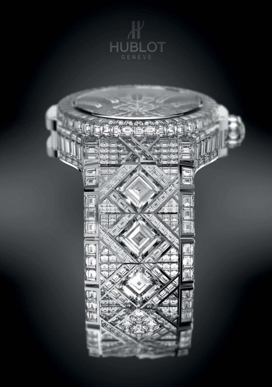 Роскошная марка Hublot на выставке Baselworld 2012 в Швейцарии, представила, по ее утверждению, самые дорогие часы в мире. Часы инкрустированы 14-каратным алмазом и стоят $ 5миллионов. Ультра-гламурные роскошные часы из белого золота содержат в общей сложности 1 292 бриллиантов, шесть из которых весят более чем в три карата каждый.