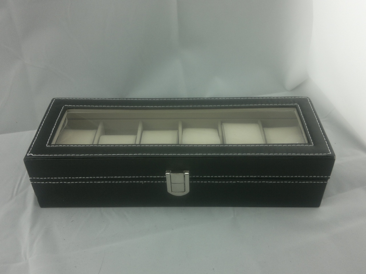 Новая шкатулка для хранения шести часов, прессованная кожа, пластиковое окно. Бюджетный вариант.