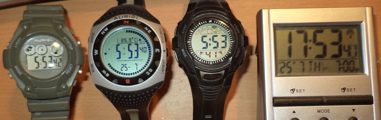 Итак, если в супермаркете продают большой контейнер с часами в блистере (прозрачной запаянной упаковке), где можно перебрать несколько десятков часов, то скорее всего вам удастся выбрать часы с хорошей точностью. Для этого вам надо иметь при себе часы настроенные точно. Далее выбираете понравившиеся вам часы имеющих минимальное отклонение от ваших. Я проверял несколько лет покупая для эксперимента разные часы в магазине Lidl ценой 5...30 Евро. Некоторые из них приведены на фотографии через неделю после установки точного времени. Источником точного времени является будильник имеющий ежечасную радиокоррекцию по стандарту DCF77 (Майнфлингене, Германия), который изображен справа. Последние черные спортивные часы были куплены 2-го января 2013 года и я проводил эксперимент в течении 6 месяцев для определения их точности, которая составила 0,1 сек в сут если часы лежат на полке. В случае, если часы постоянно на руке, то за 15 дней не удалось визуально наблюдать расхождение с точным временем.