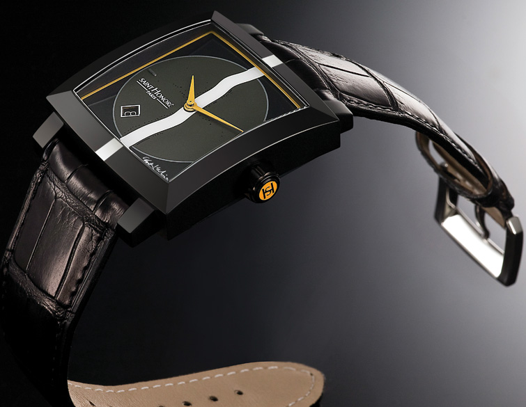 Квадратный корпус из нержавеющей стали с черным покрытием PVD. Заводная головка с выгравированным логотипом Saint Honore на фоне оранжевого лака. Циферблат защищает выгнутое сапфировое стекло. Задняя крышка корпуса прозрачная. Водонепронизаемость до 50 метров.