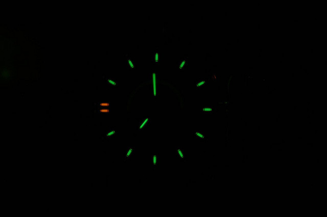 Тритиевая подсветка на стрелках и часовых метках, оранжевого и зеленого цветов.