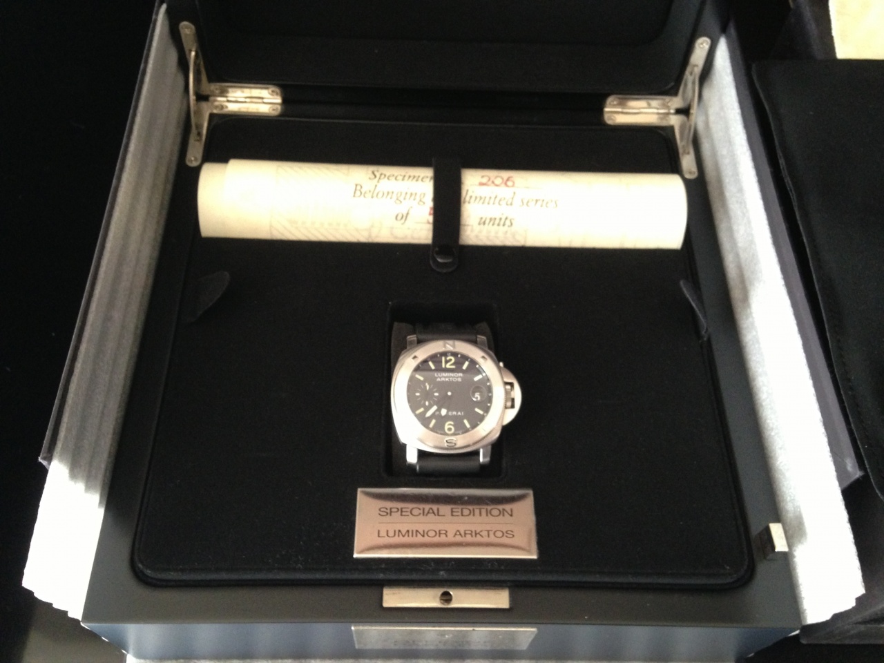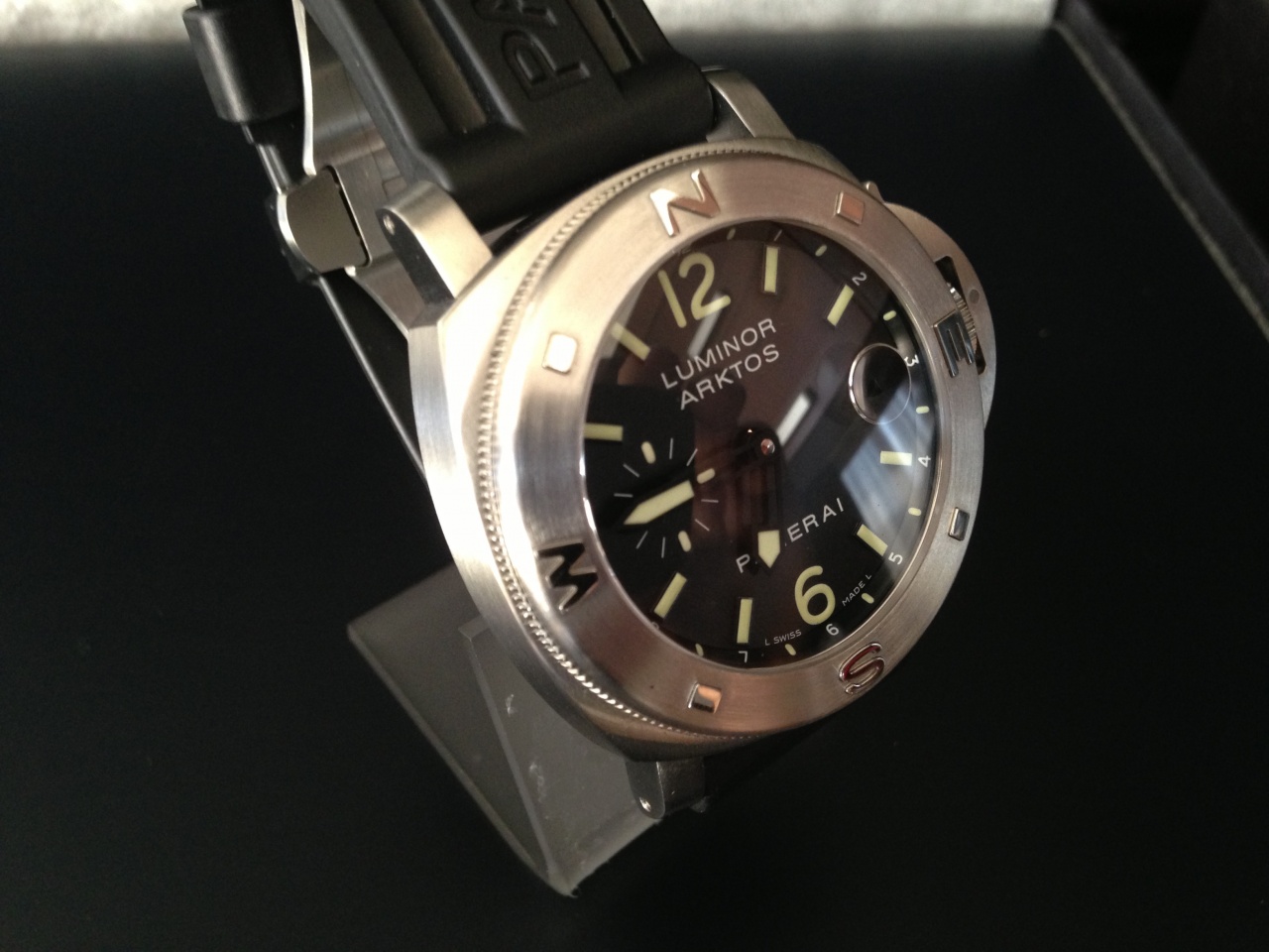 Корпус: нержавеющая сталь, диаметр 44 мм, скоба, сапфировое стекло с антибликом. Задняя крышка из нержавеющей стали из гравировкой "Officine Panerai и Arktos Amagnetic, карта экспедиции и подпись Майка Хорна. Рант вращающийся с метками N,E,S,W.