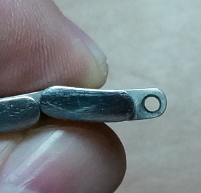 надфилем.толщиной 1,5 мм растачиваем крайнее отверствие и ставим шпильку 1,8 мм.проблема решена.если не хотите проделывать данную операцию,значит покупаем себе пакет шпилек и иногда гнутые заменяем.